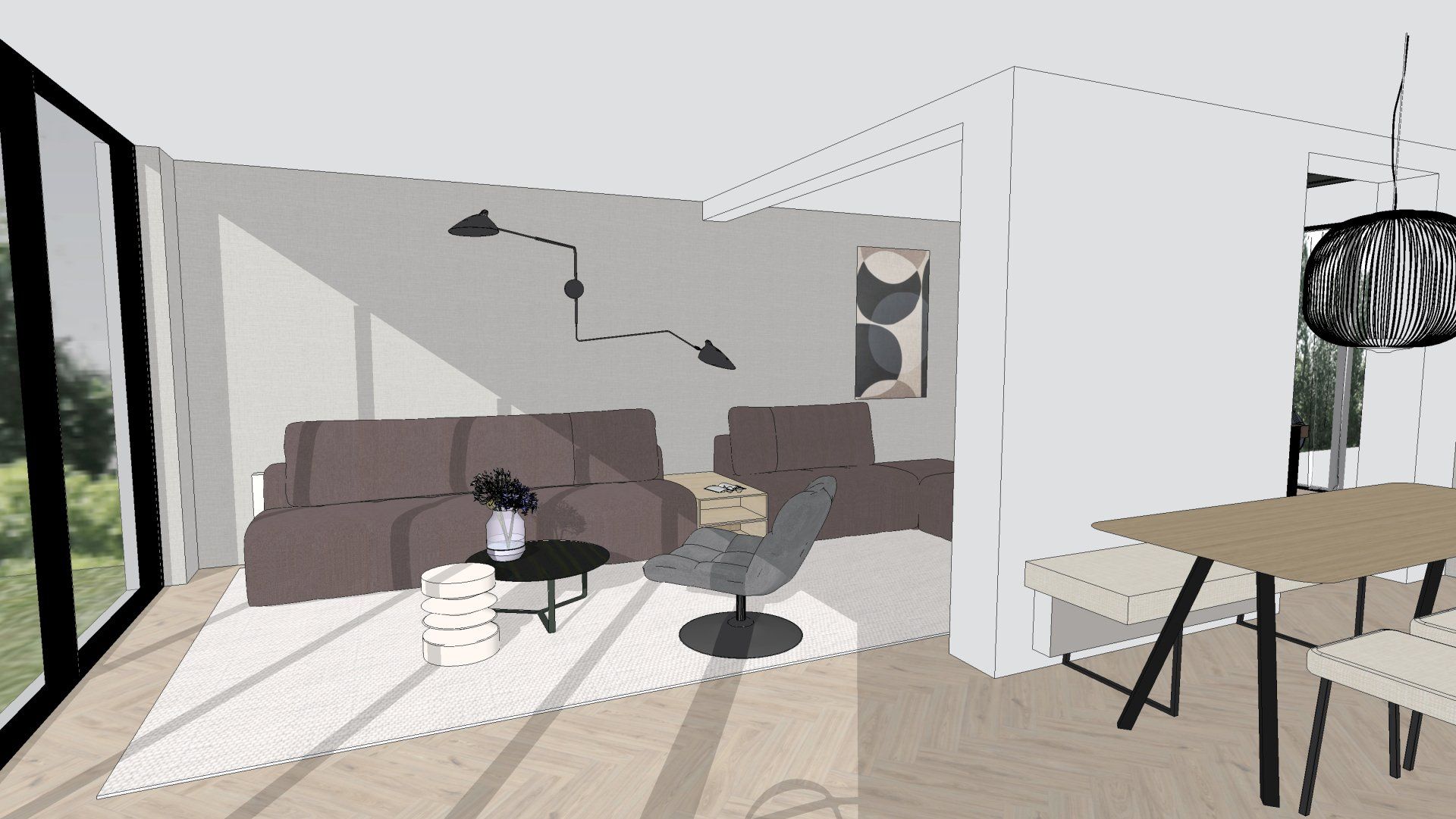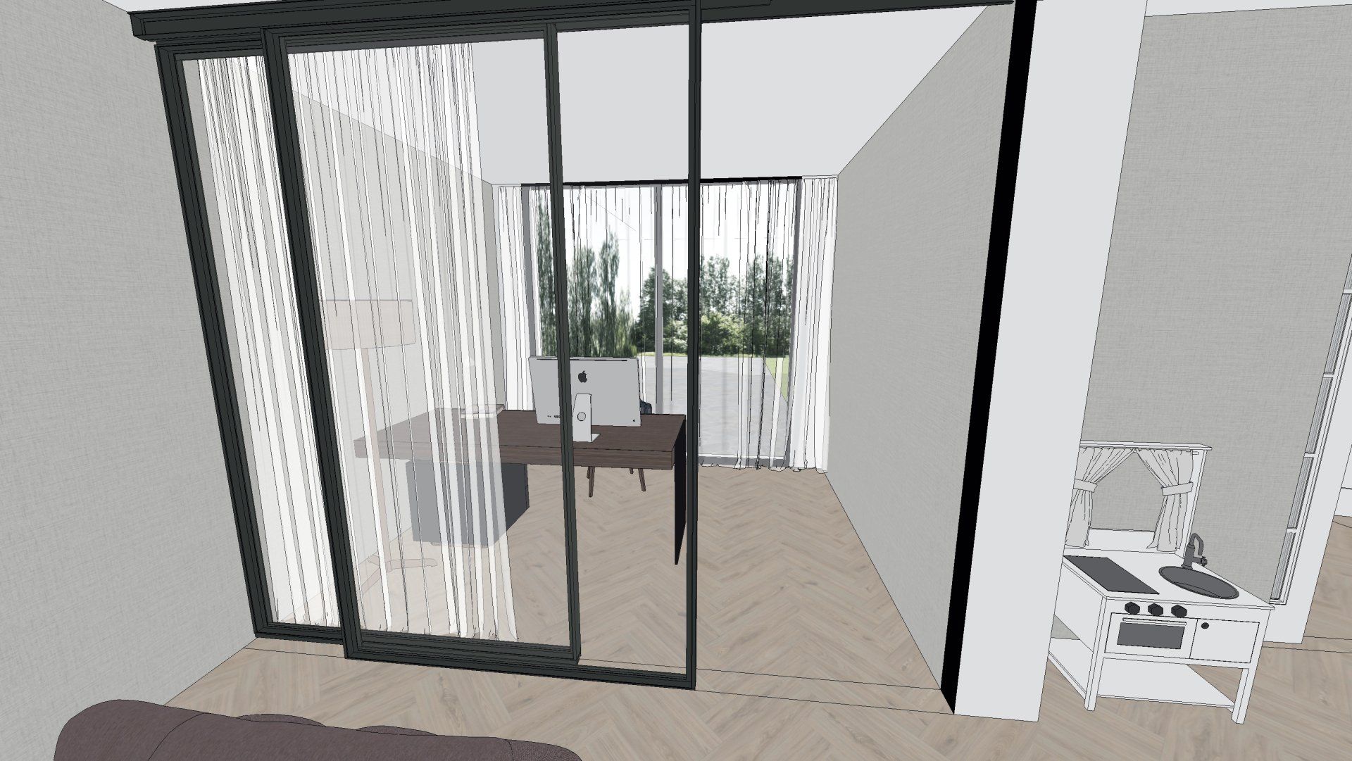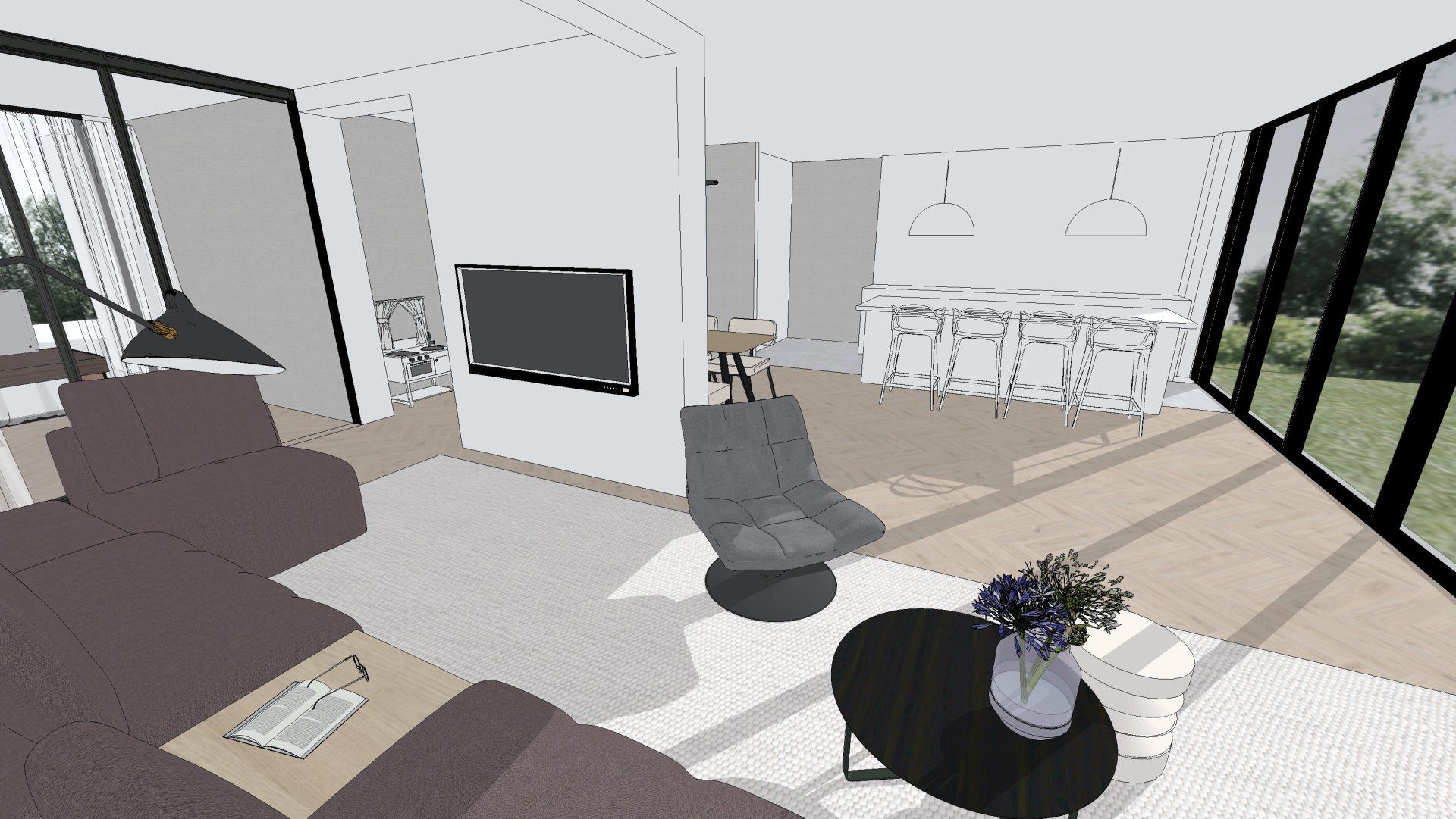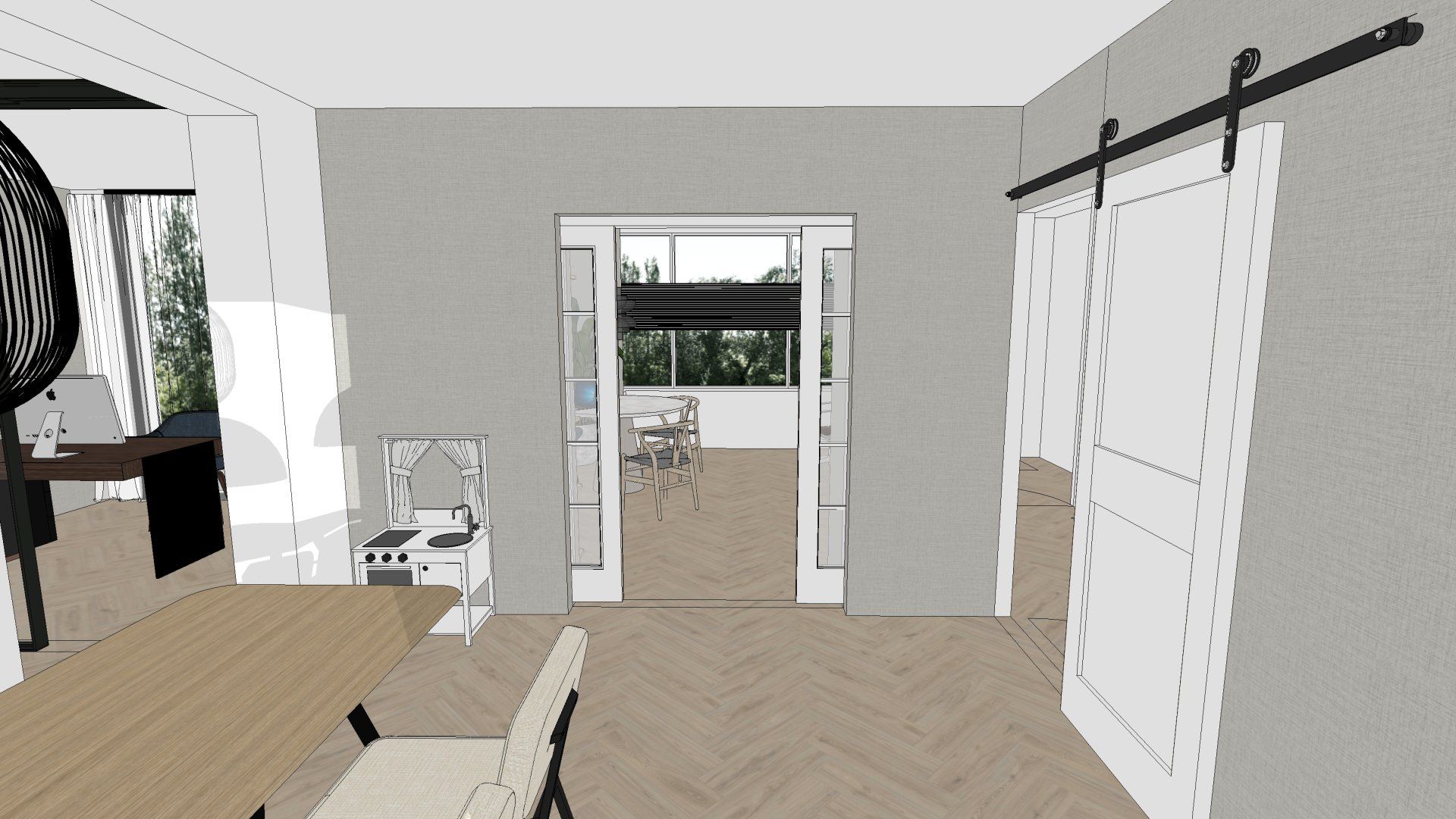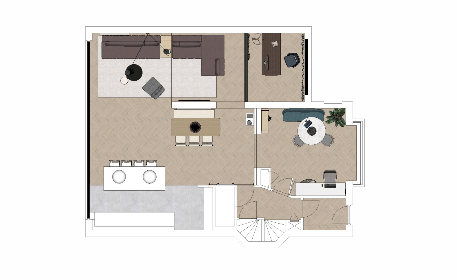 De wens is om hier twee thuiswerk-kantoren te creëren, een nieuwe ruime zithoek te plaatsen en de gashaarden te verwijderen. Door twee muren door te breken wordt de ruimte van de voormalige garage bij de woning betrokken. Door de doorgang naar de woonkamer te verplaatsen ontstaat er nu een logische routing. Deze nieuwe situatie voldoet perfect aan bij de wensen van dit gezin. Door de 3D visuals krijg je inzicht in de gemaakte keuzes. Met dit plan kunnen er offertes worden opgevraagd en gaan we gefaseerd deze verbouwing uitvoeren.