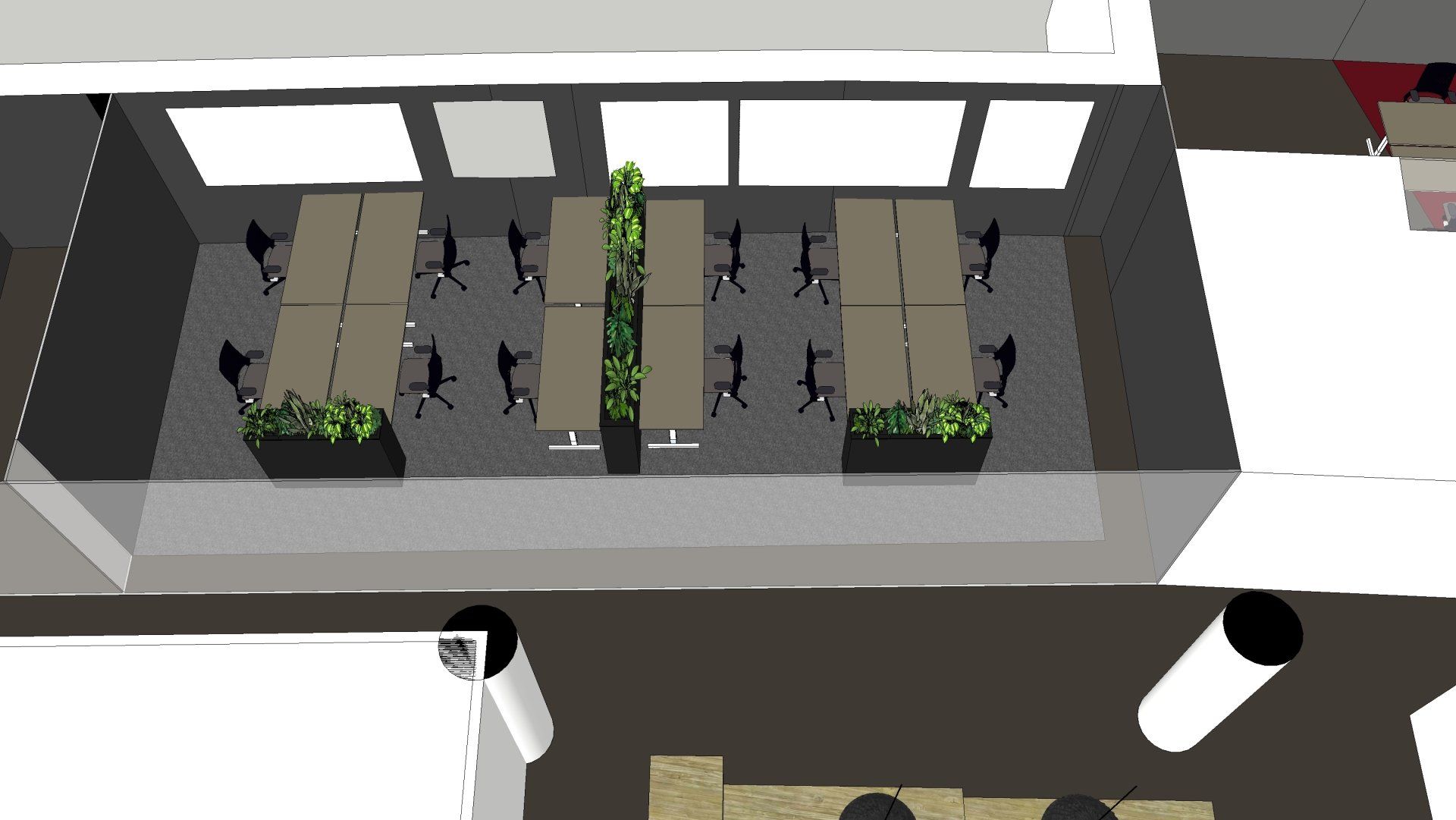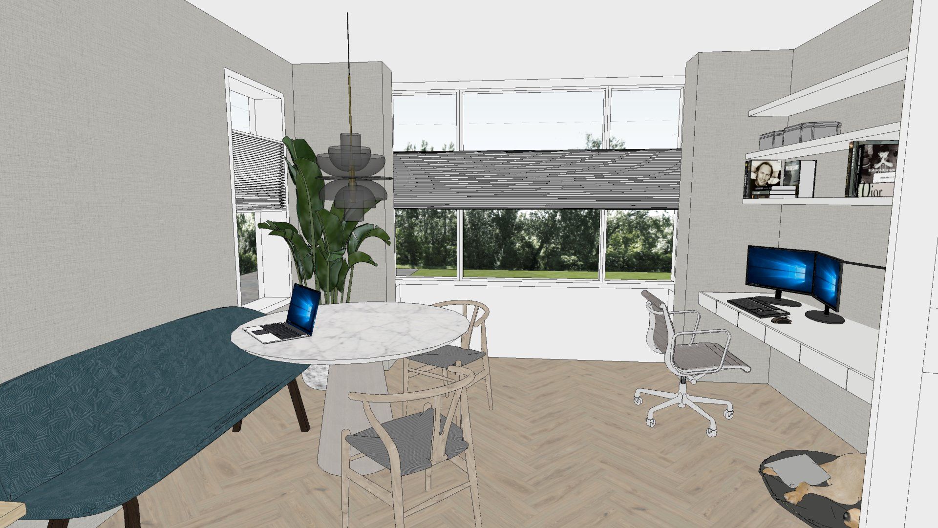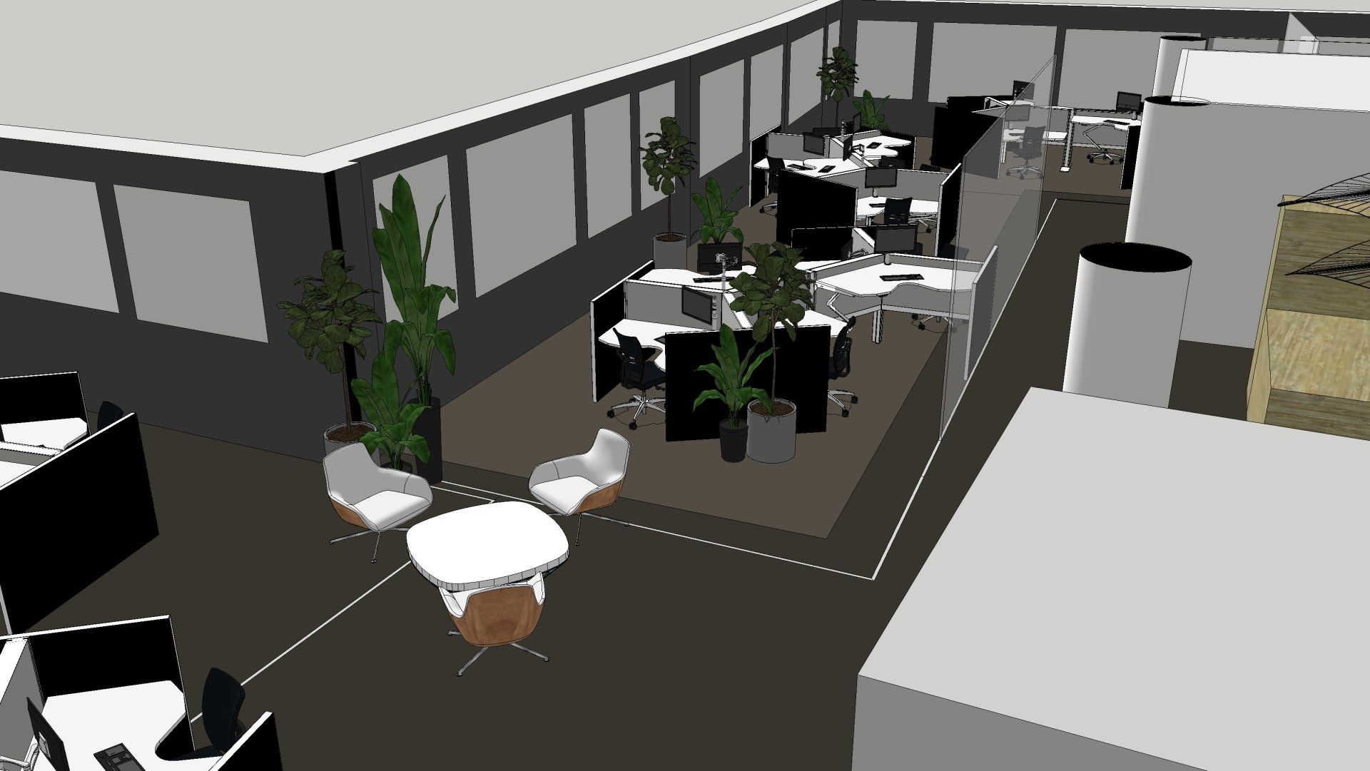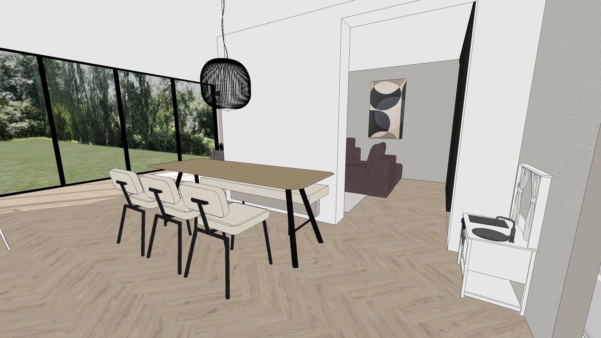 De wens is om hier twee thuiswerk-kantoren te creëren, een nieuwe ruime zithoek te plaatsen en de gashaarden te verwijderen. Door twee muren door te breken wordt de ruimte van de voormalige garage bij de woning betrokken. Door de doorgang naar de woonkamer te verplaatsen ontstaat er nu een logische routing. Deze nieuwe situatie voldoet perfect aan bij de wensen van dit gezin. Door de 3D visuals krijg je inzicht in de gemaakte keuzes. Met dit plan kunnen er offertes worden opgevraagd en gaan we gefaseerd deze verbouwing uitvoeren.