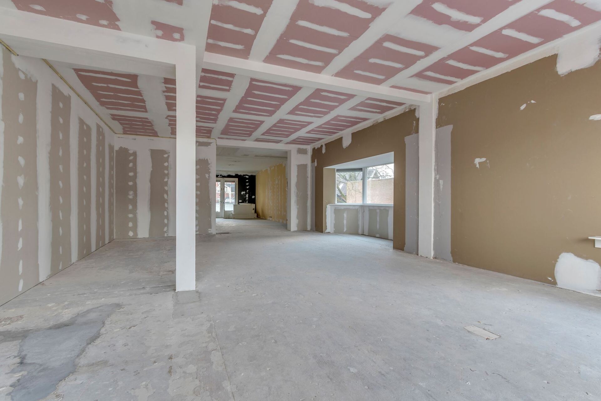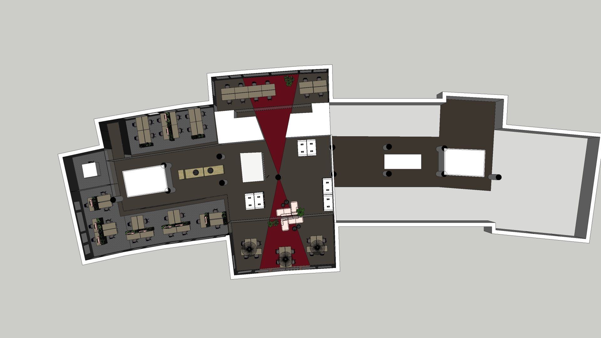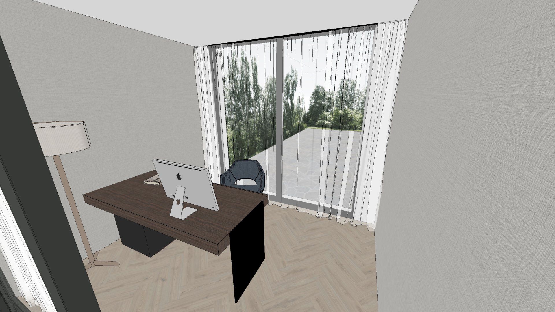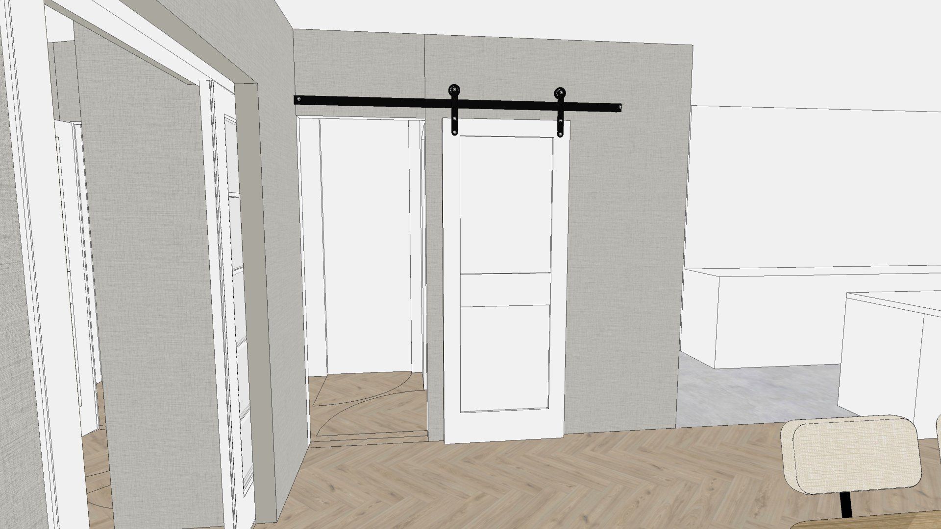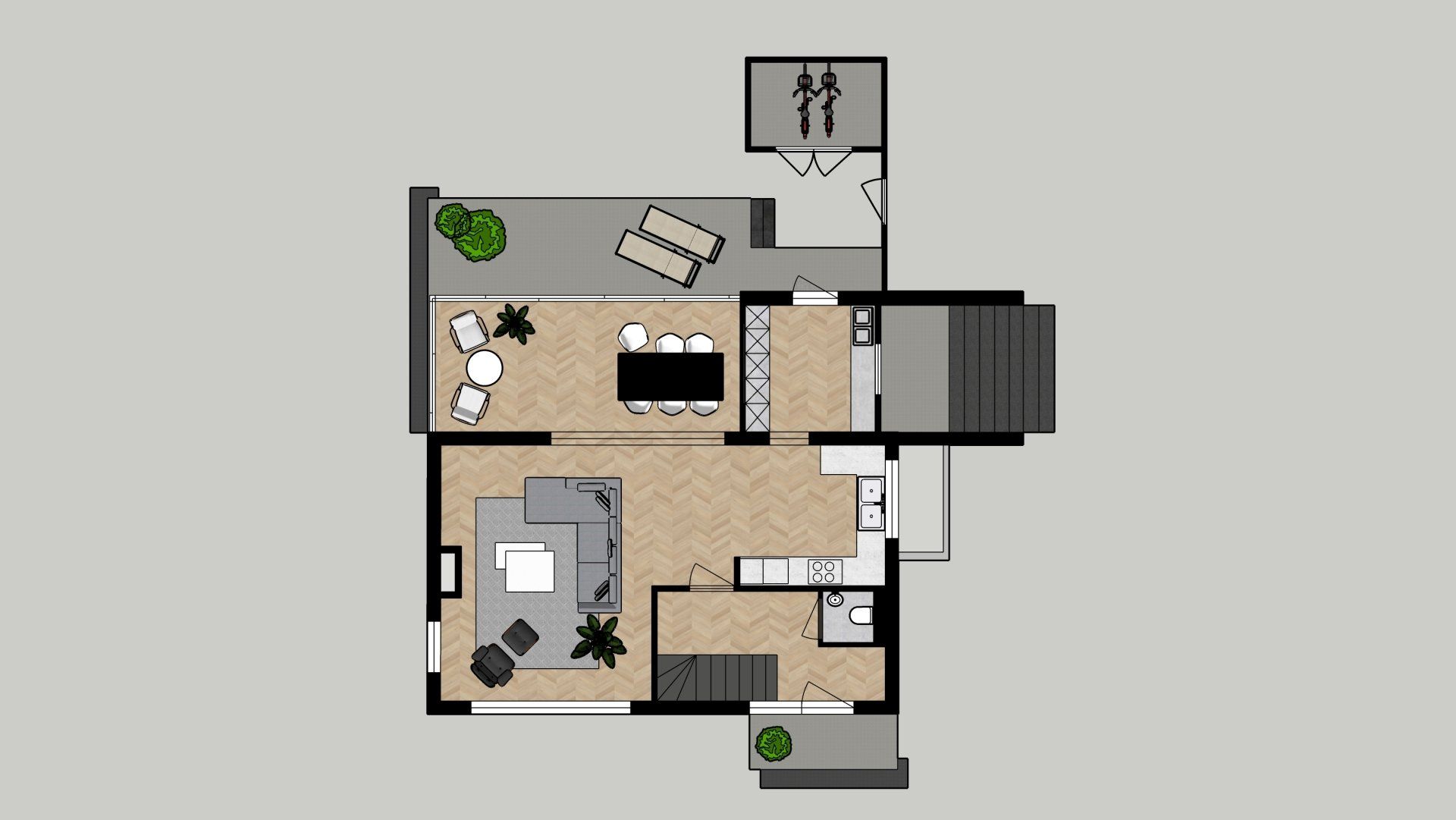 De wens is om hier twee thuiswerk-kantoren te creëren, een nieuwe ruime zithoek te plaatsen en de gashaarden te verwijderen. Door twee muren door te breken wordt de ruimte van de voormalige garage bij de woning betrokken. Door de doorgang naar de woonkamer te verplaatsen ontstaat er nu een logische routing. Deze nieuwe situatie voldoet perfect aan bij de wensen van dit gezin. Door de 3D visuals krijg je inzicht in de gemaakte keuzes. Met dit plan kunnen er offertes worden opgevraagd en gaan we gefaseerd deze verbouwing uitvoeren.
