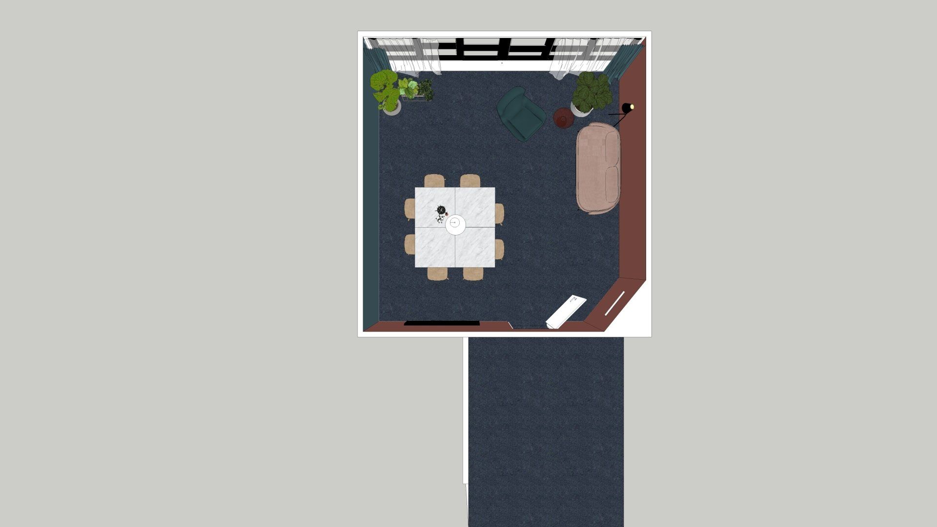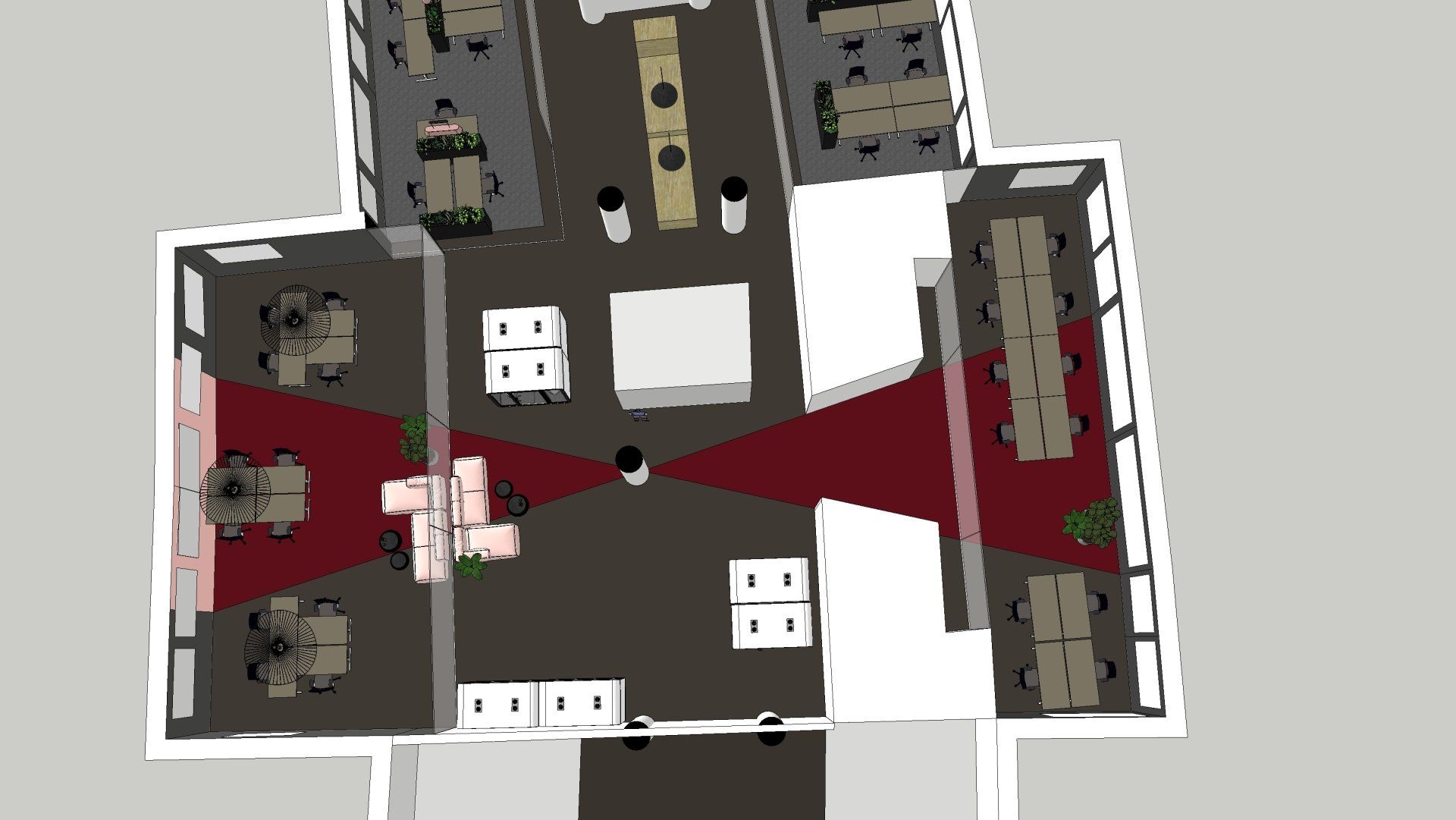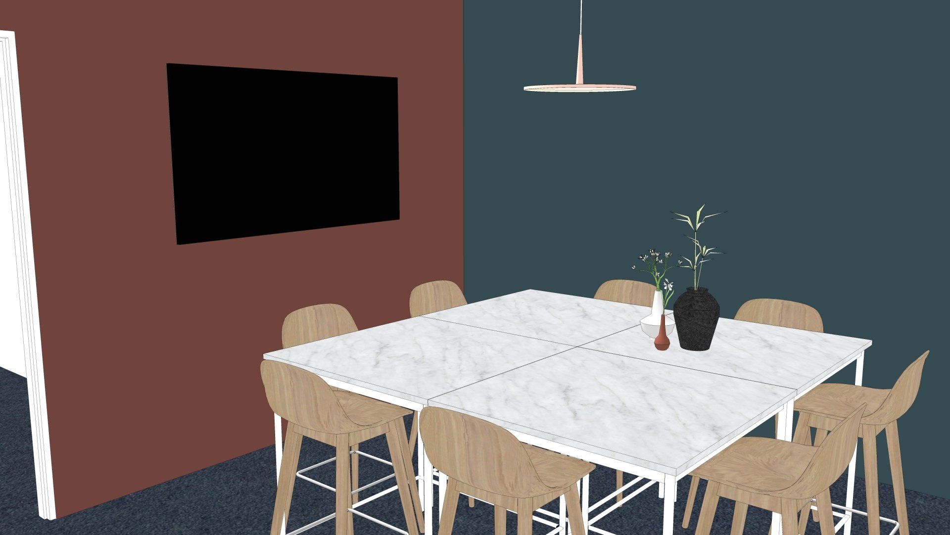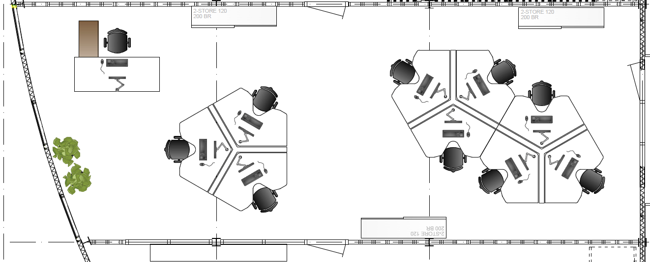 De wens is om hier twee thuiswerk-kantoren te creëren, een nieuwe ruime zithoek te plaatsen en de gashaarden te verwijderen. Door twee muren door te breken wordt de ruimte van de voormalige garage bij de woning betrokken. Door de doorgang naar de woonkamer te verplaatsen ontstaat er nu een logische routing. Deze nieuwe situatie voldoet perfect aan bij de wensen van dit gezin. Door de 3D visuals krijg je inzicht in de gemaakte keuzes. Met dit plan kunnen er offertes worden opgevraagd en gaan we gefaseerd deze verbouwing uitvoeren.