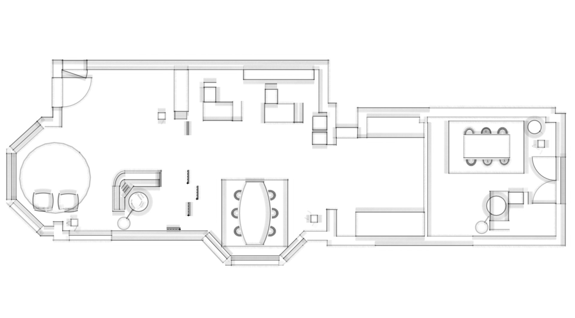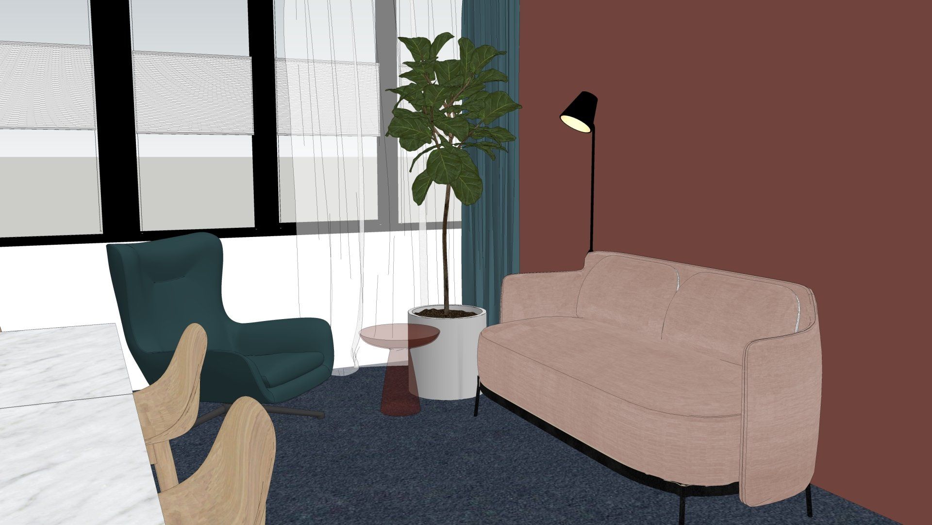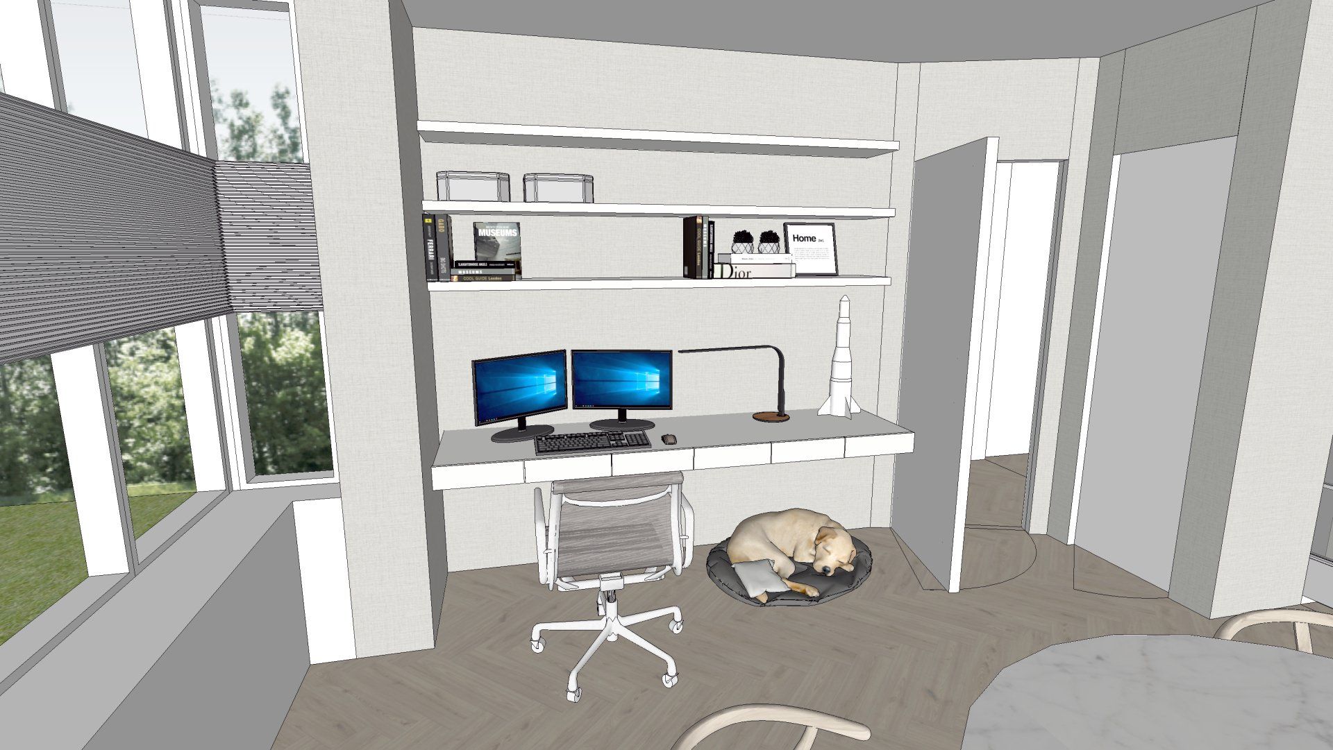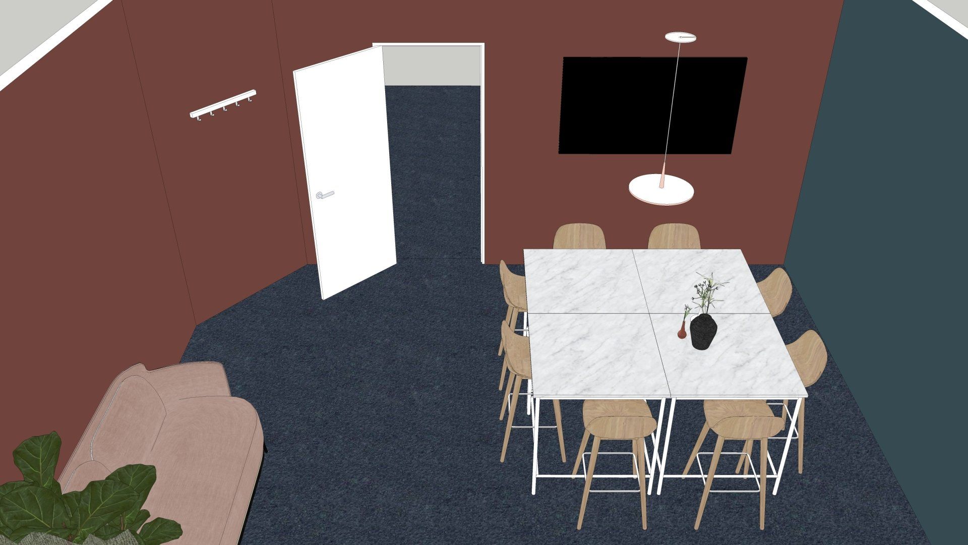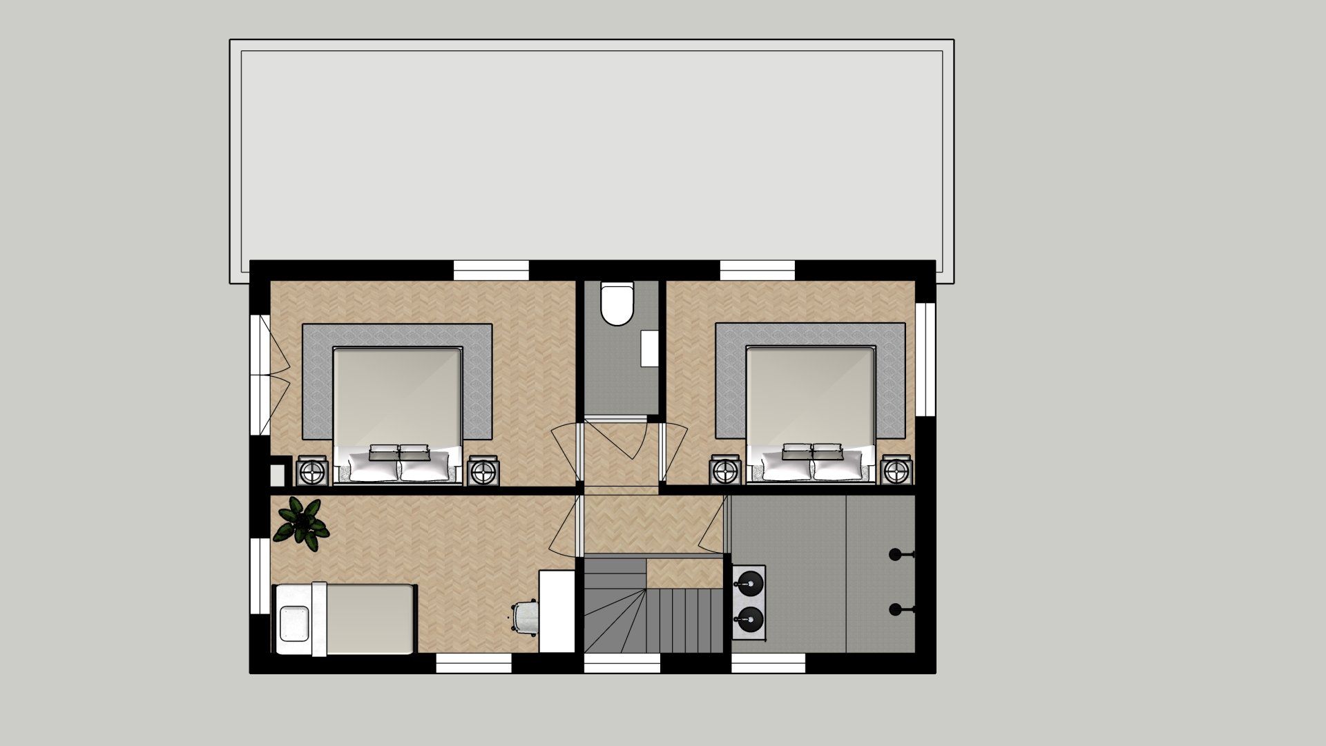 De wens is om hier twee thuiswerk-kantoren te creëren, een nieuwe ruime zithoek te plaatsen en de gashaarden te verwijderen. Door twee muren door te breken wordt de ruimte van de voormalige garage bij de woning betrokken. Door de doorgang naar de woonkamer te verplaatsen ontstaat er nu een logische routing. Deze nieuwe situatie voldoet perfect aan bij de wensen van dit gezin. Door de 3D visuals krijg je inzicht in de gemaakte keuzes. Met dit plan kunnen er offertes worden opgevraagd en gaan we gefaseerd deze verbouwing uitvoeren.