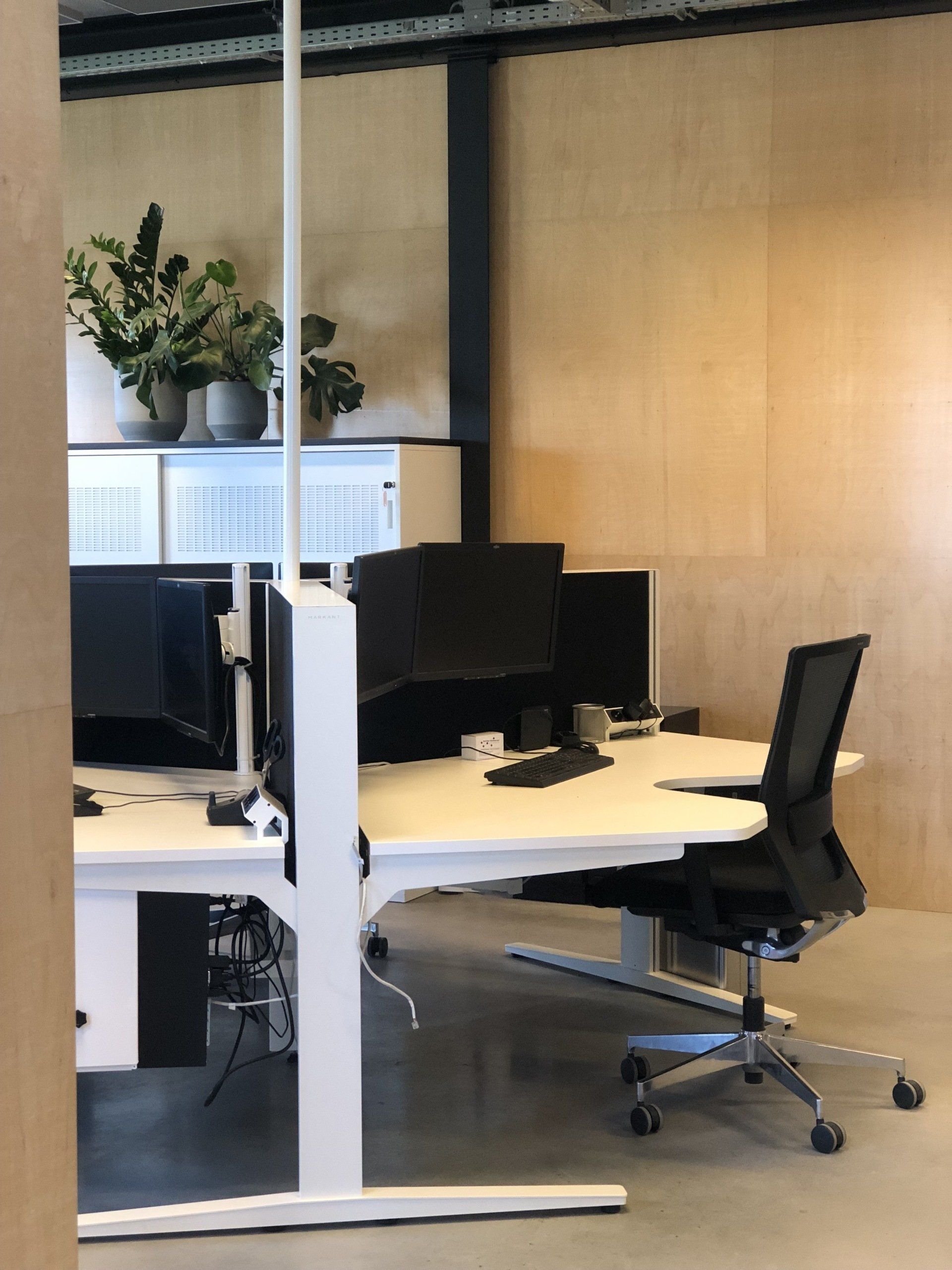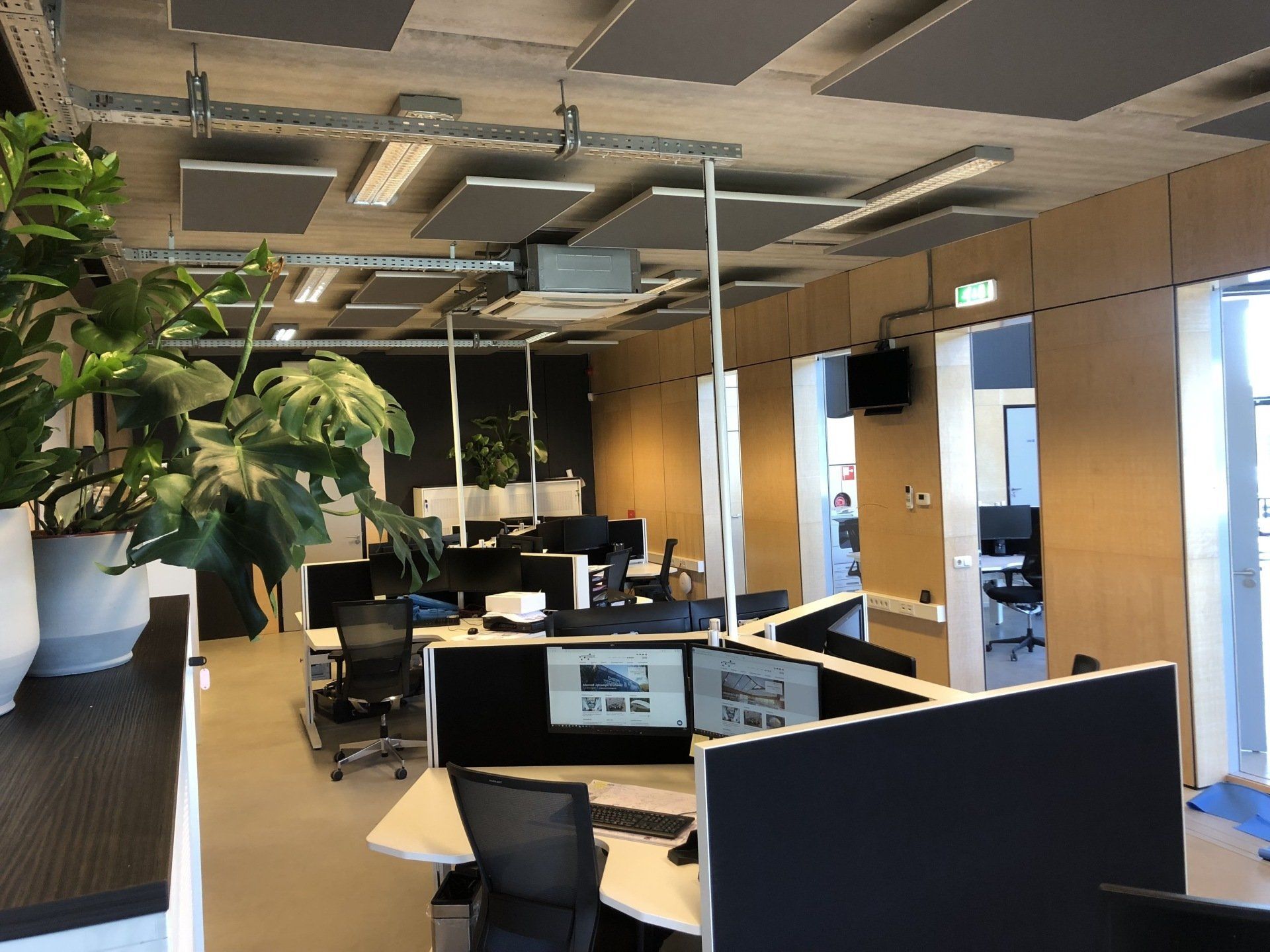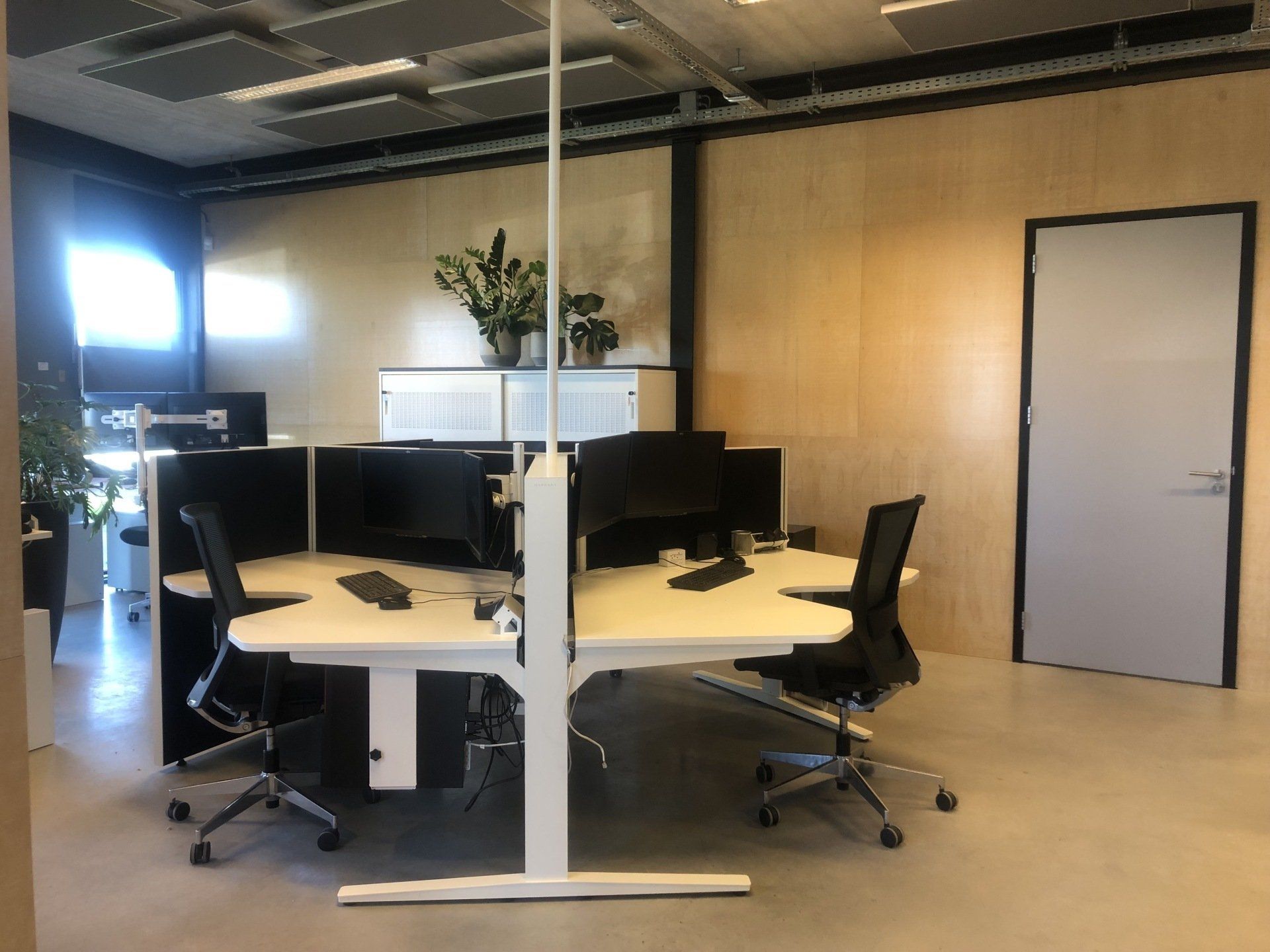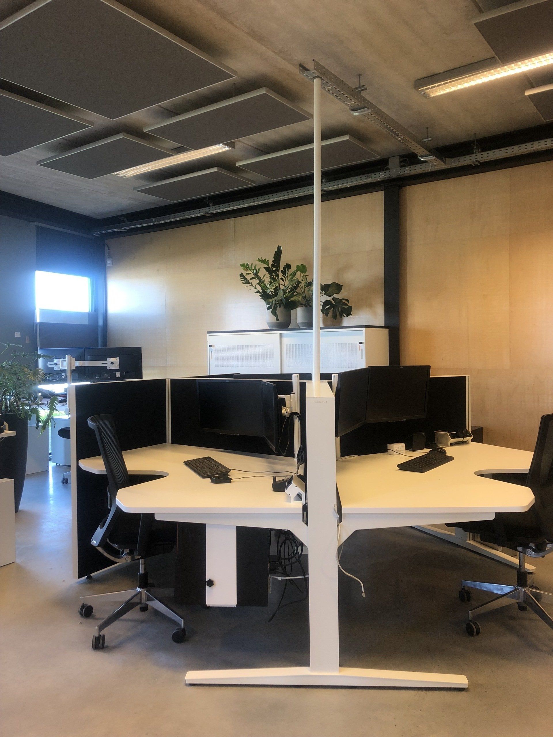 Er werden meer werkplekken gecreëerd door nieuw meubilair te plaatsen. De bureau's zijn voorzien van geluiddempende tussenwanden waar al het kabelwerk netjes in weggewerkt is. Door de combinatie met de geluidsabsorberende plafondpanelen, de stijlvolle en functionele raamdecoratie en de luchtzuiverende planten is deze werkomgeving enorm verbeterd.