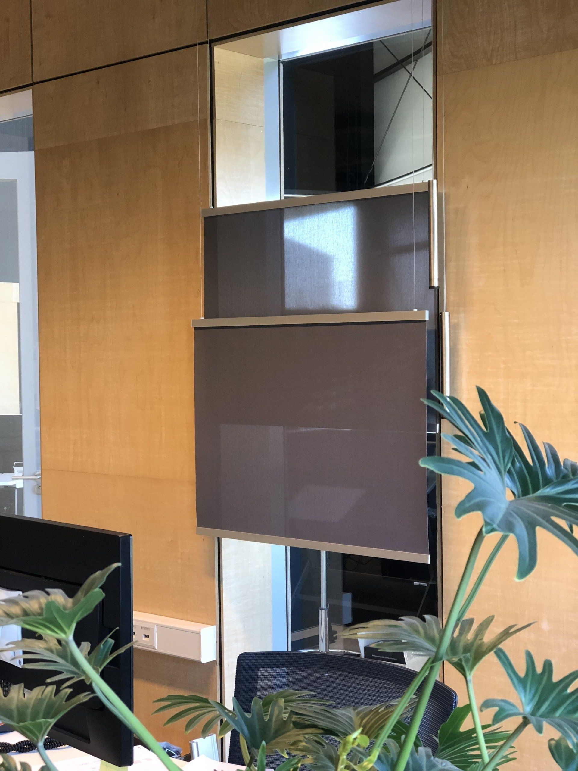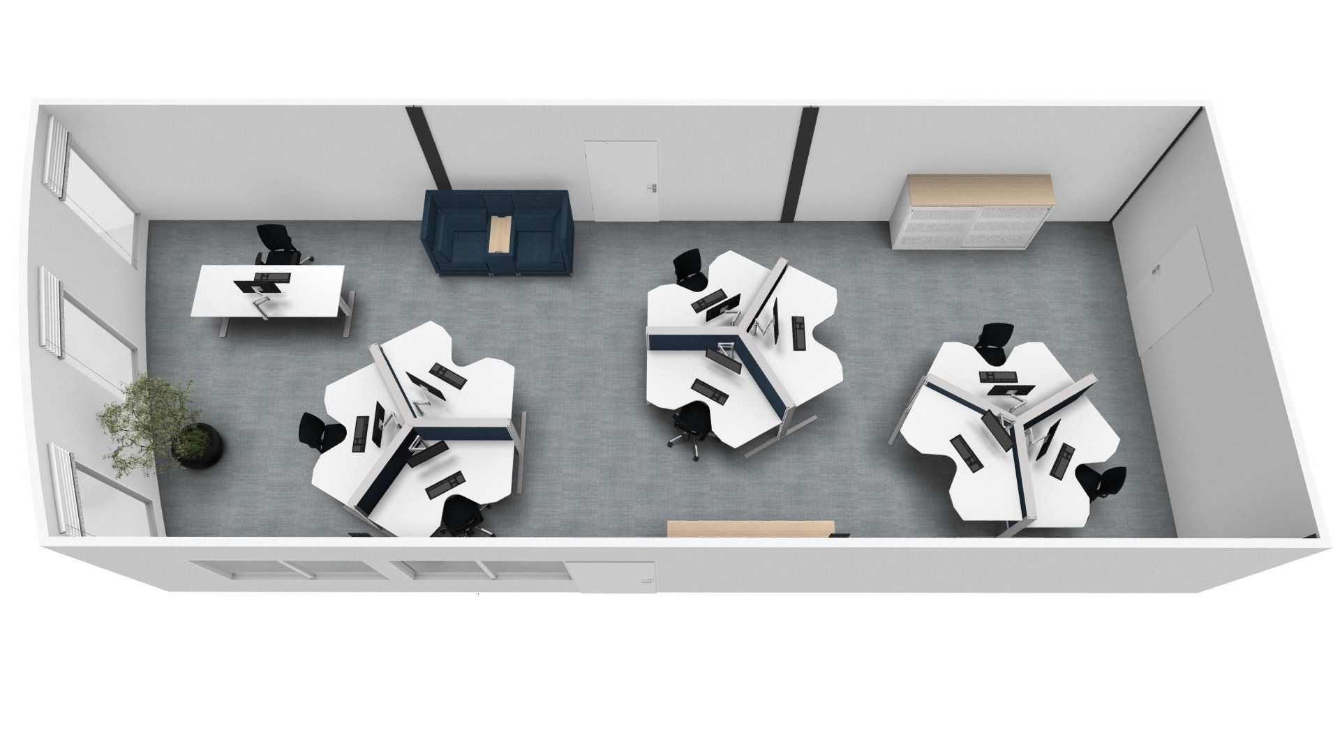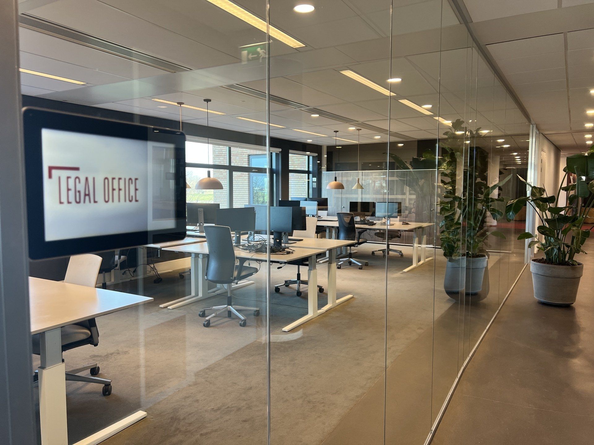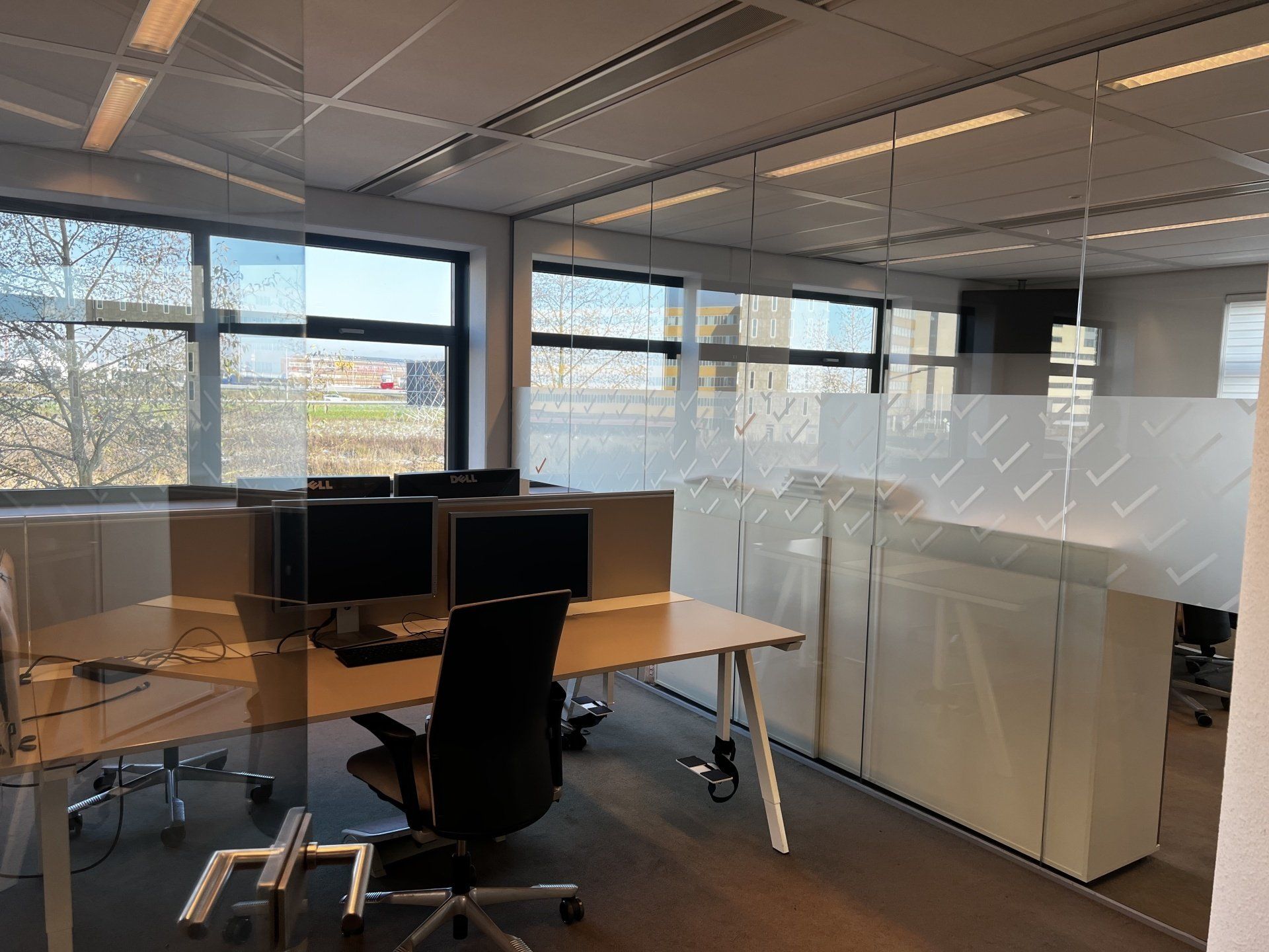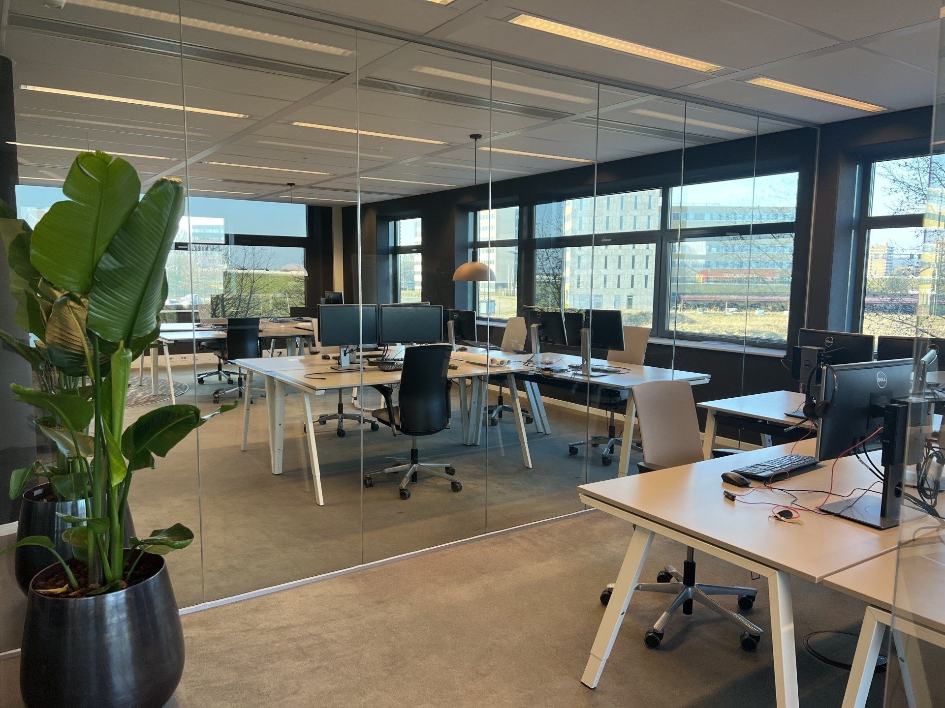 Er werden meer werkplekken gecreëerd door nieuw meubilair te plaatsen. De bureau's zijn voorzien van geluiddempende tussenwanden waar al het kabelwerk netjes in weggewerkt is. Door de combinatie met de geluidsabsorberende plafondpanelen, de stijlvolle en functionele raamdecoratie en de luchtzuiverende planten is deze werkomgeving enorm verbeterd.