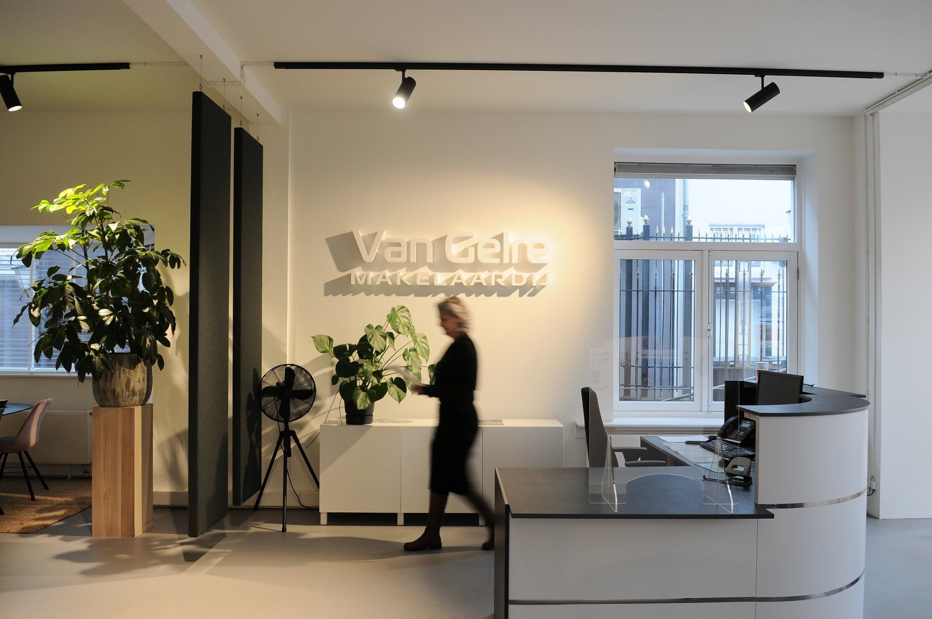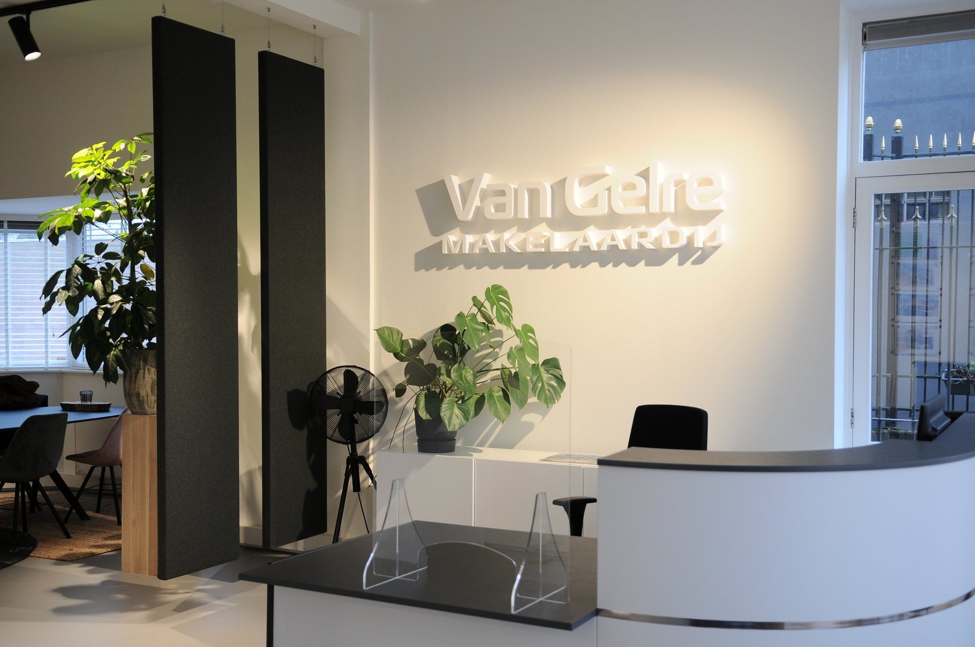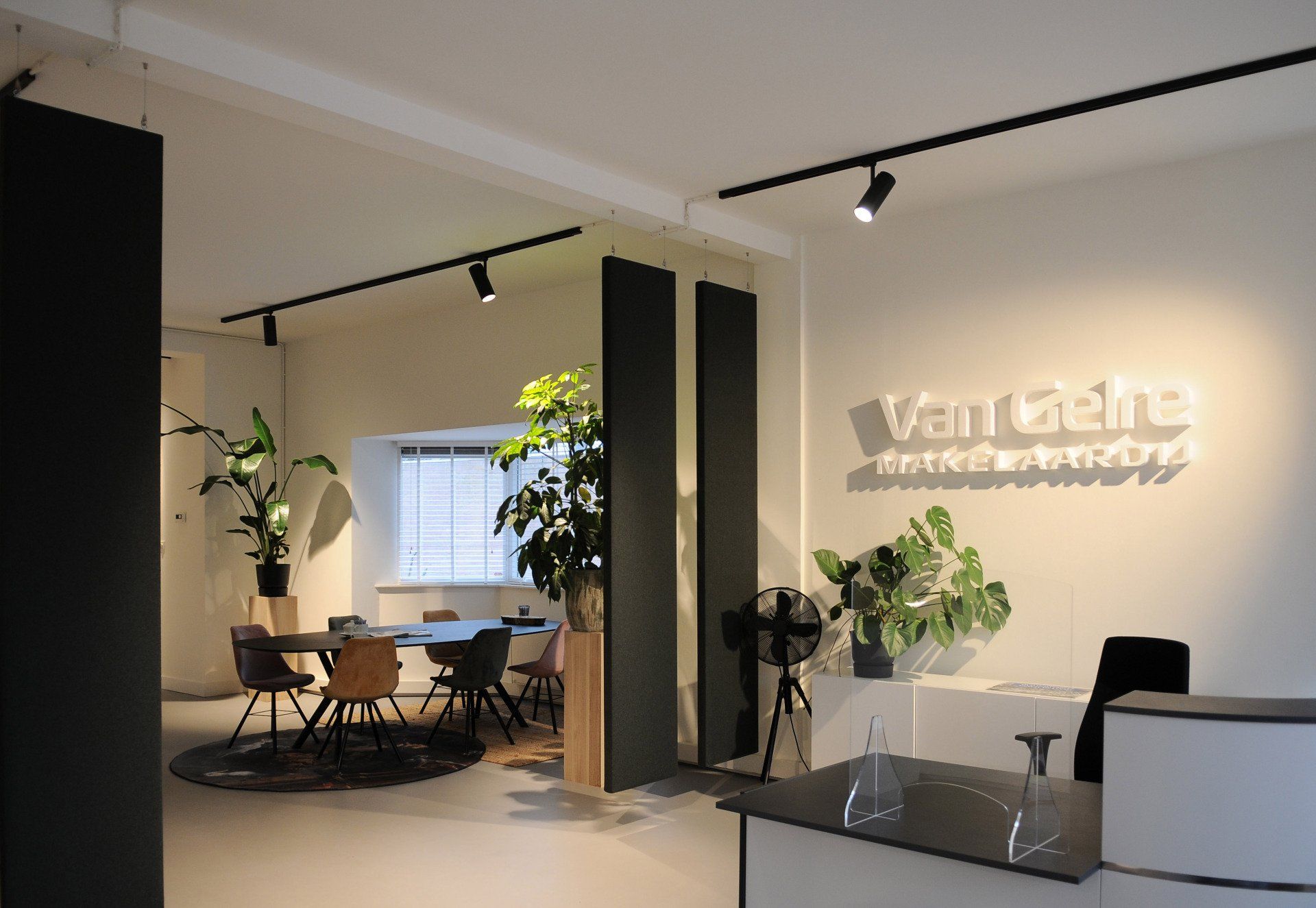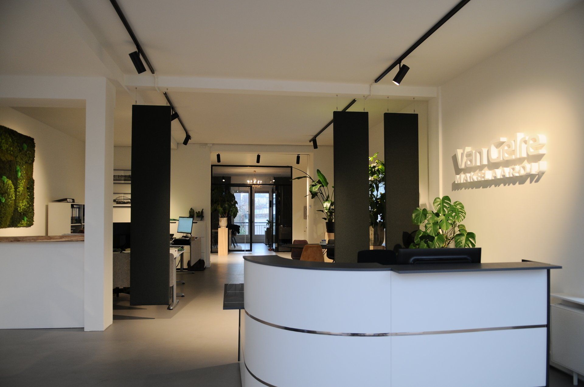 Nu was het de makelaar zelf die ging verhuizen. Deze gave ruimte is omgetoverd tot een modern kantoor waar extra aandacht is besteed aan de akoestiek. Door de op maat gemaakte akoestische baffles blijft de ruimte zijn open karakter behouden, maar scheidt het toch de ontvangst van het kantoorgedeelte. Door de planten op pilaren te plaatsen benadrukt dit de royale hoogte en geeft dit een heel ruimtelijk gevoel.