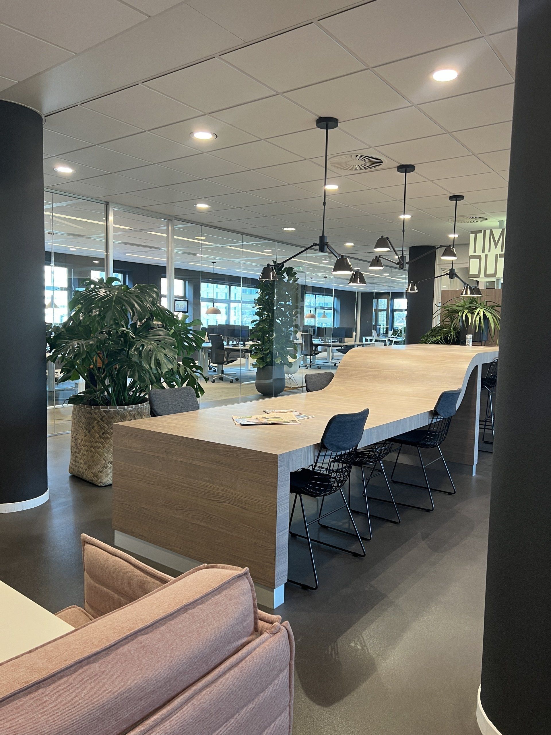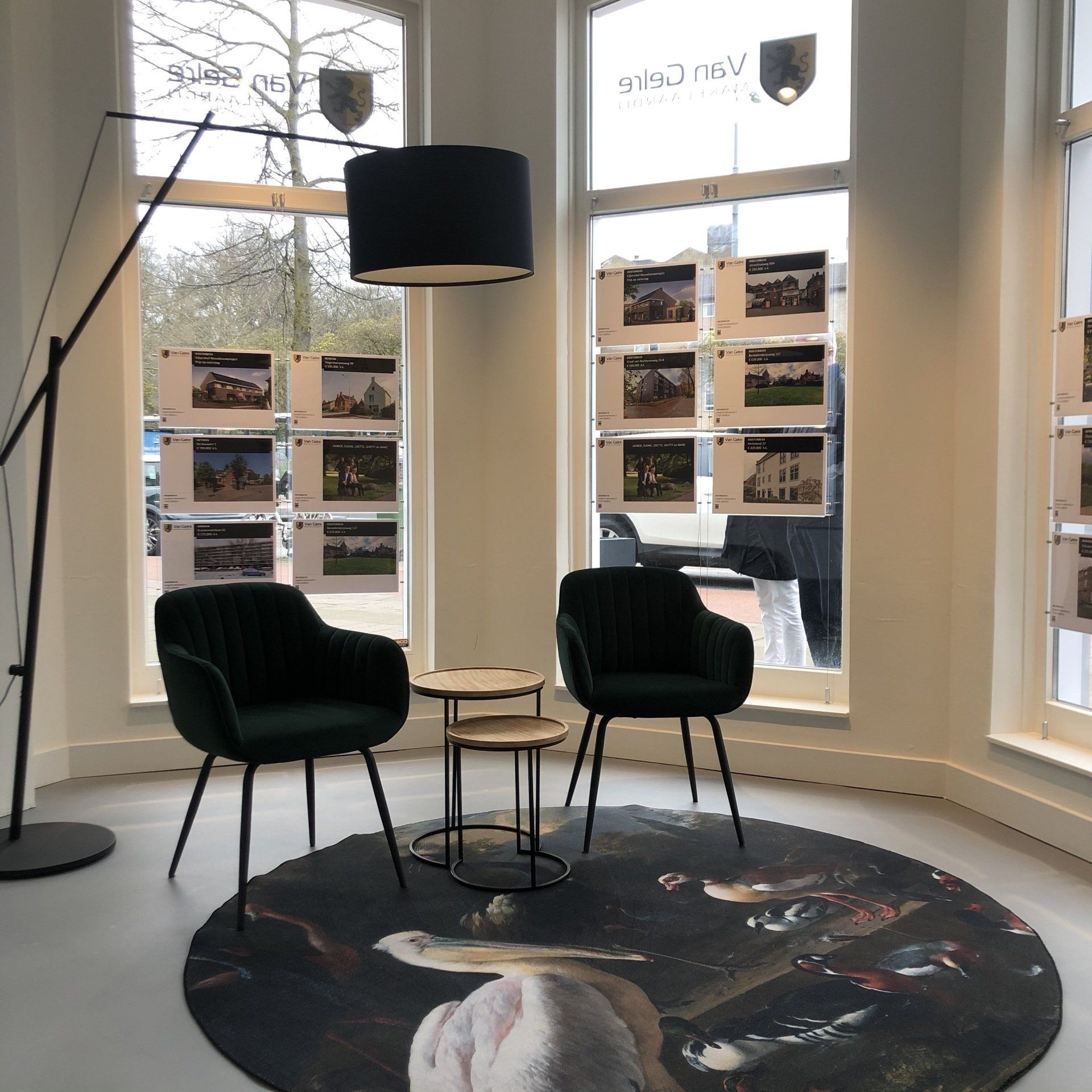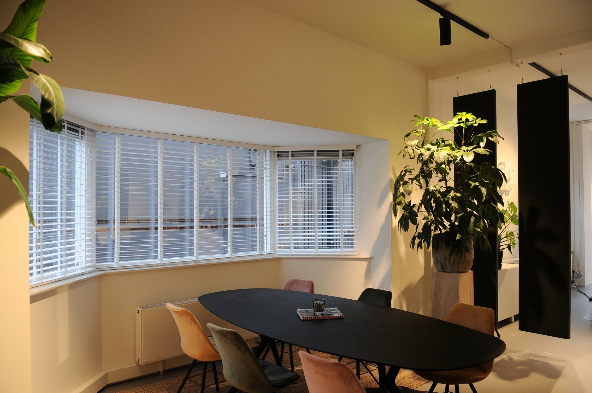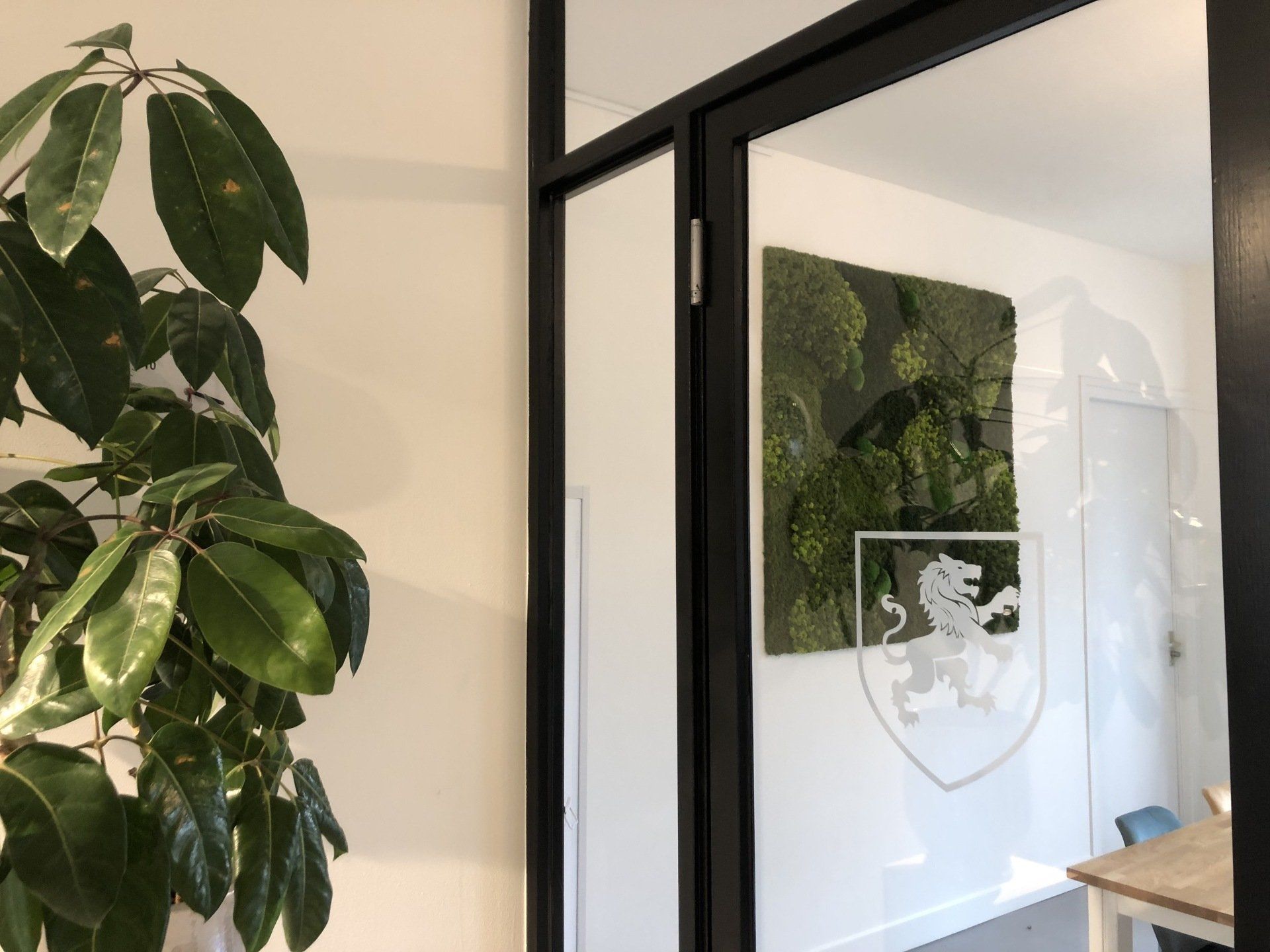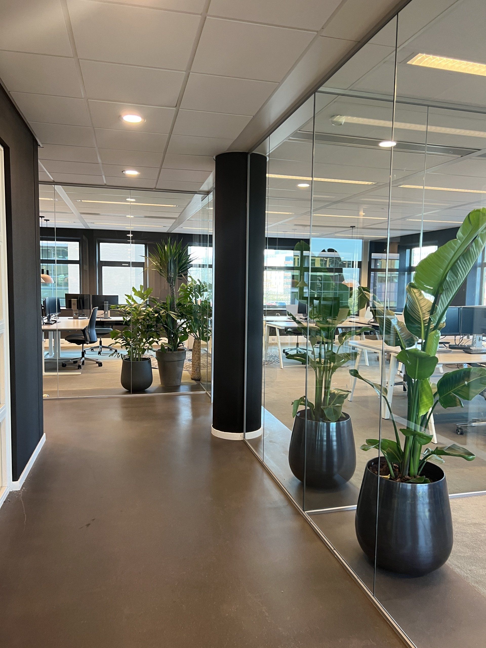 Nu was het de makelaar zelf die ging verhuizen. Deze gave ruimte is omgetoverd tot een modern kantoor waar extra aandacht is besteed aan de akoestiek. Door de op maat gemaakte akoestische baffles blijft de ruimte zijn open karakter behouden, maar scheidt het toch de ontvangst van het kantoorgedeelte. Door de planten op pilaren te plaatsen benadrukt dit de royale hoogte en geeft dit een heel ruimtelijk gevoel.