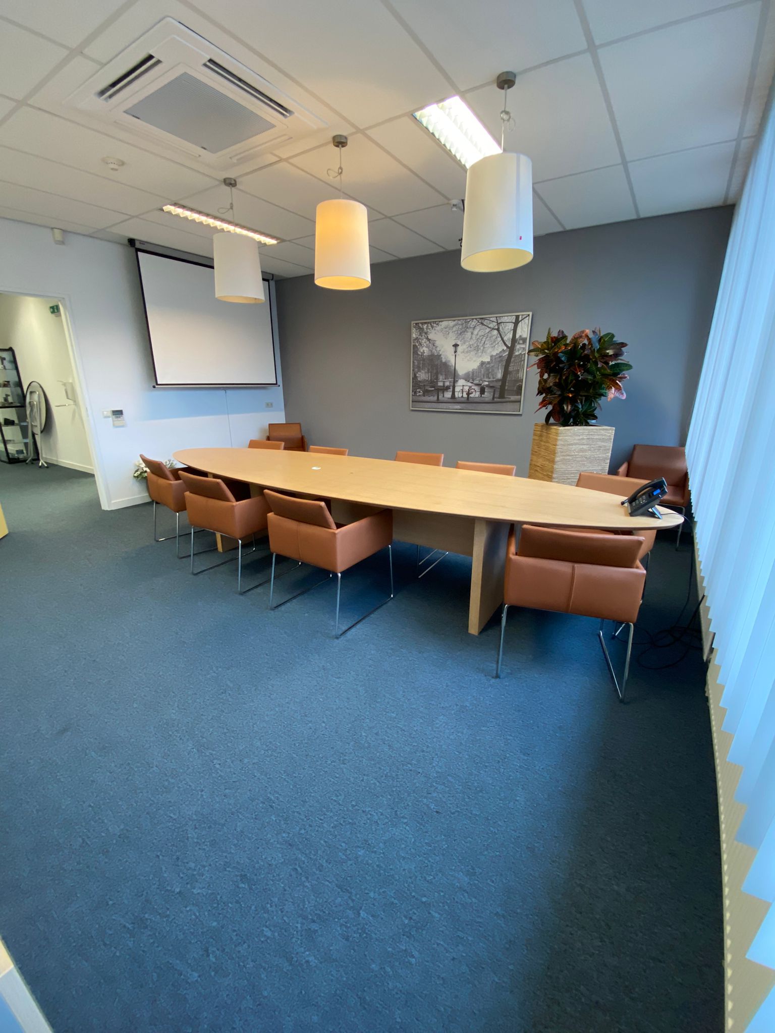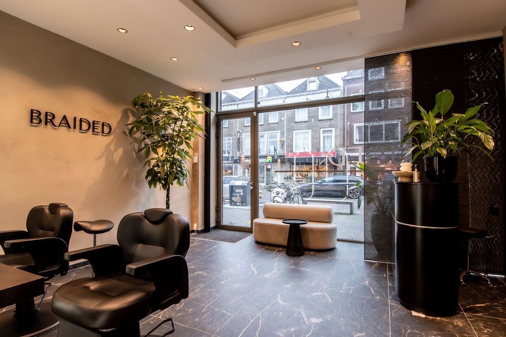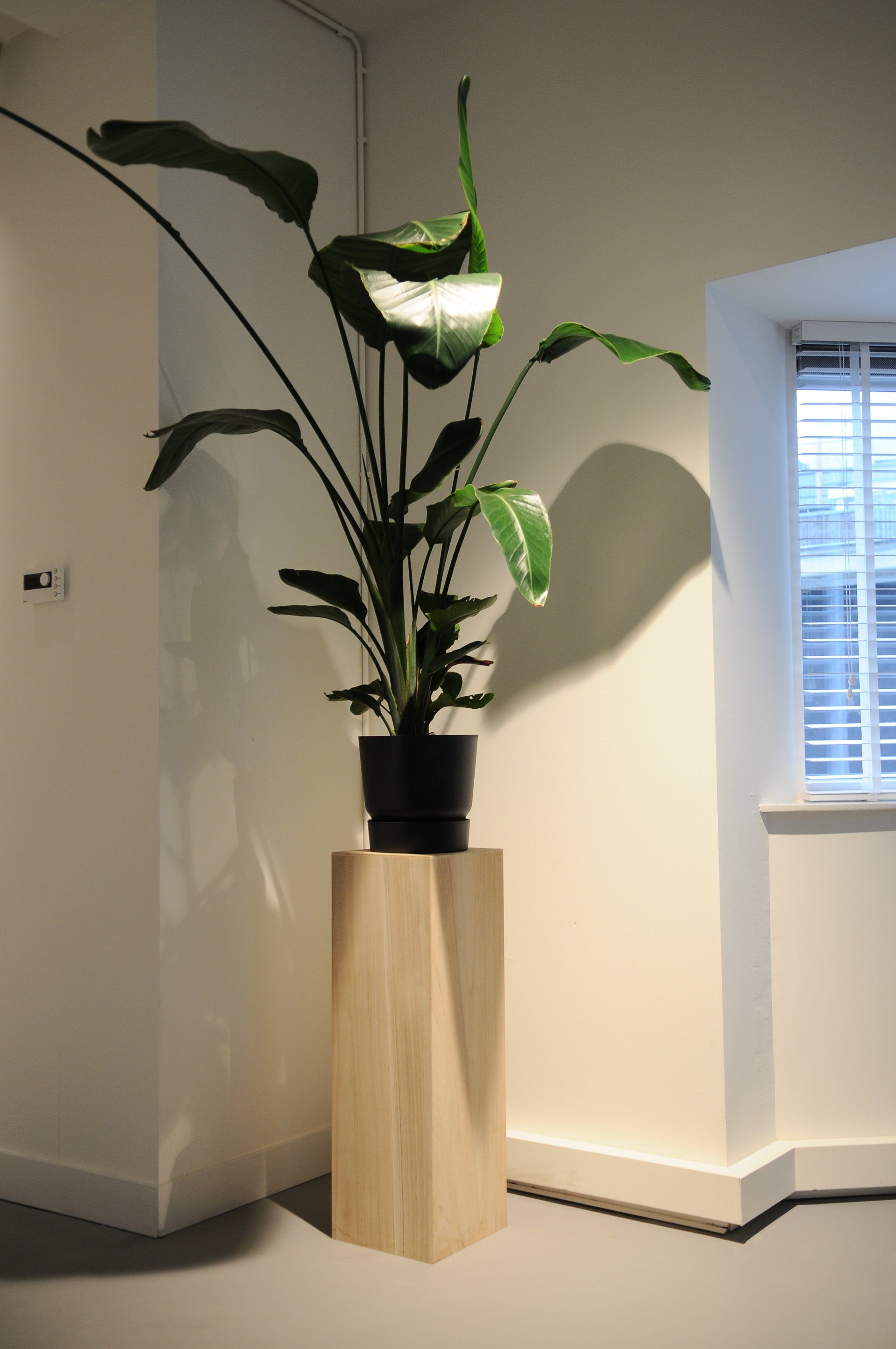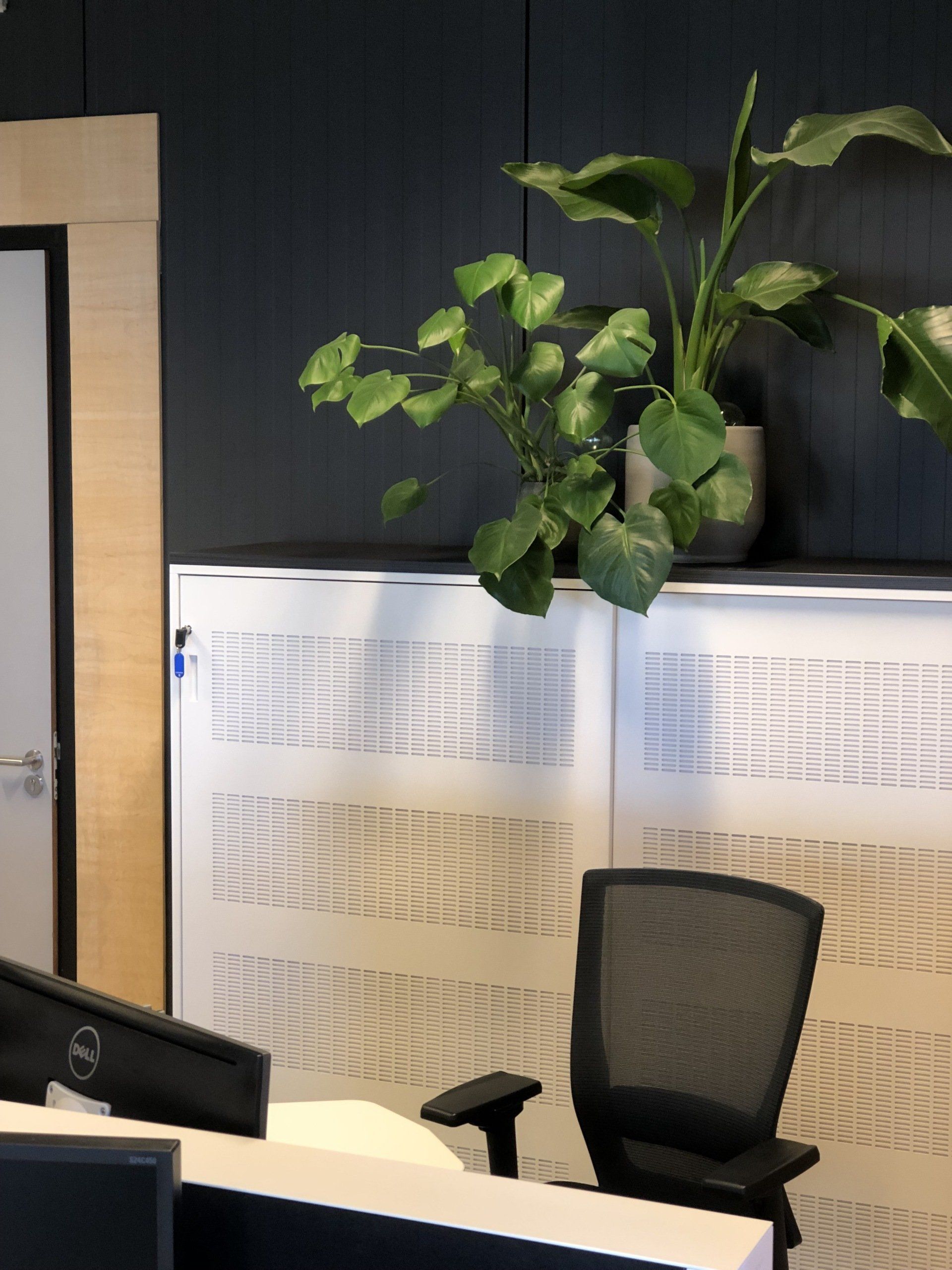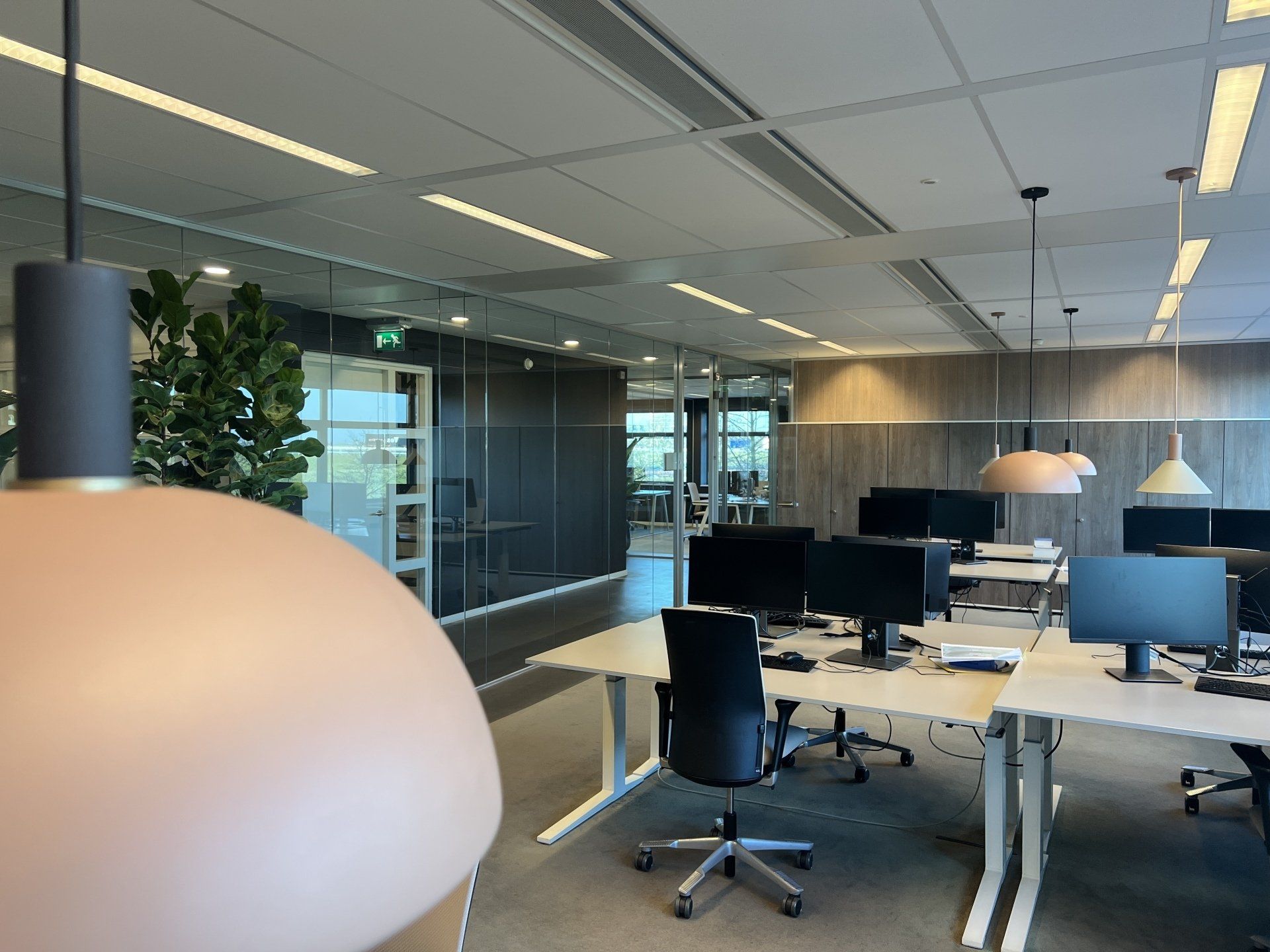 Nu was het de makelaar zelf die ging verhuizen. Deze gave ruimte is omgetoverd tot een modern kantoor waar extra aandacht is besteed aan de akoestiek. Door de op maat gemaakte akoestische baffles blijft de ruimte zijn open karakter behouden, maar scheidt het toch de ontvangst van het kantoorgedeelte. Door de planten op pilaren te plaatsen benadrukt dit de royale hoogte en geeft dit een heel ruimtelijk gevoel.