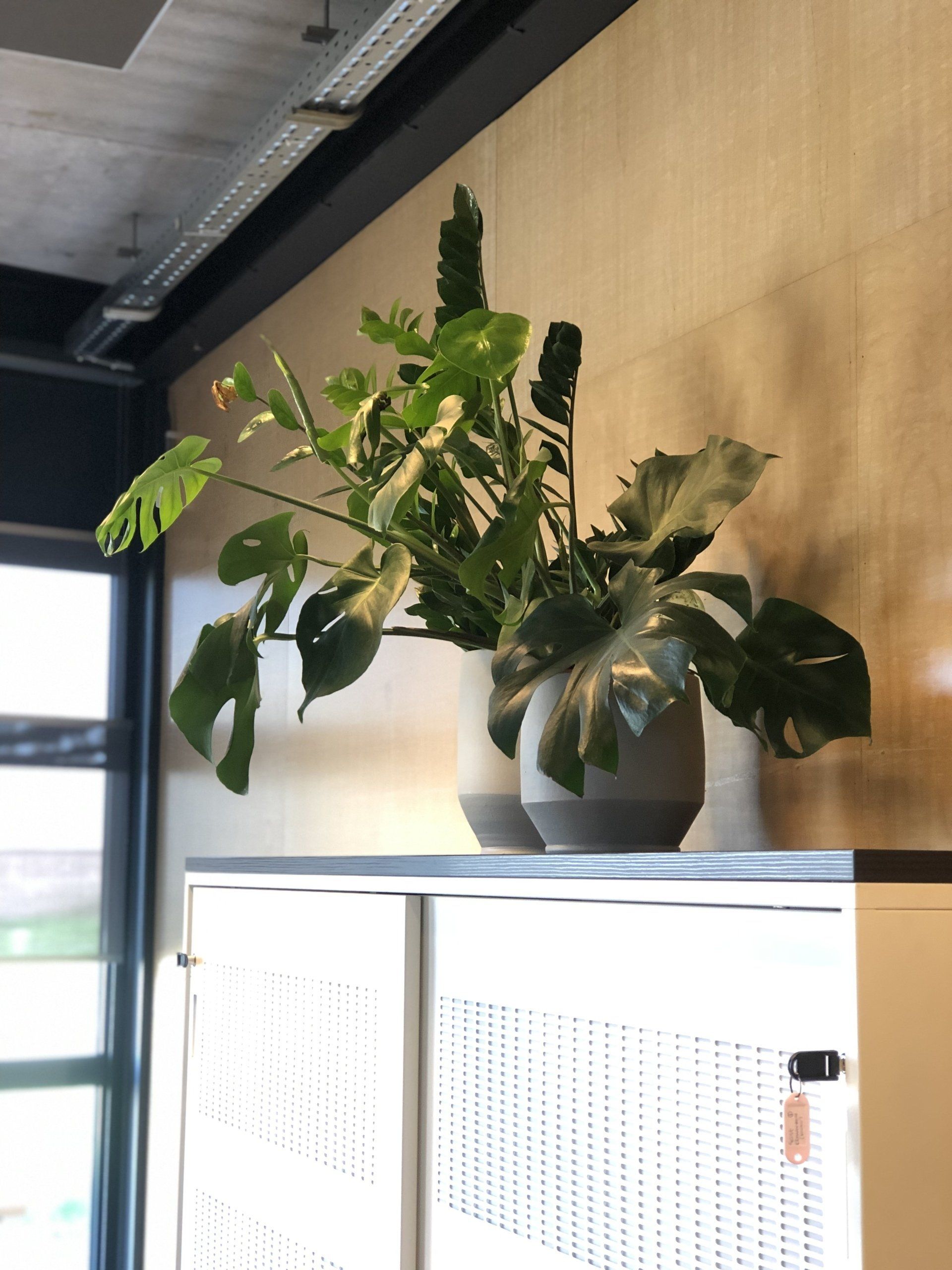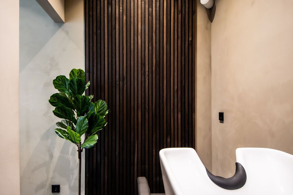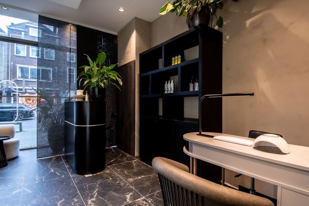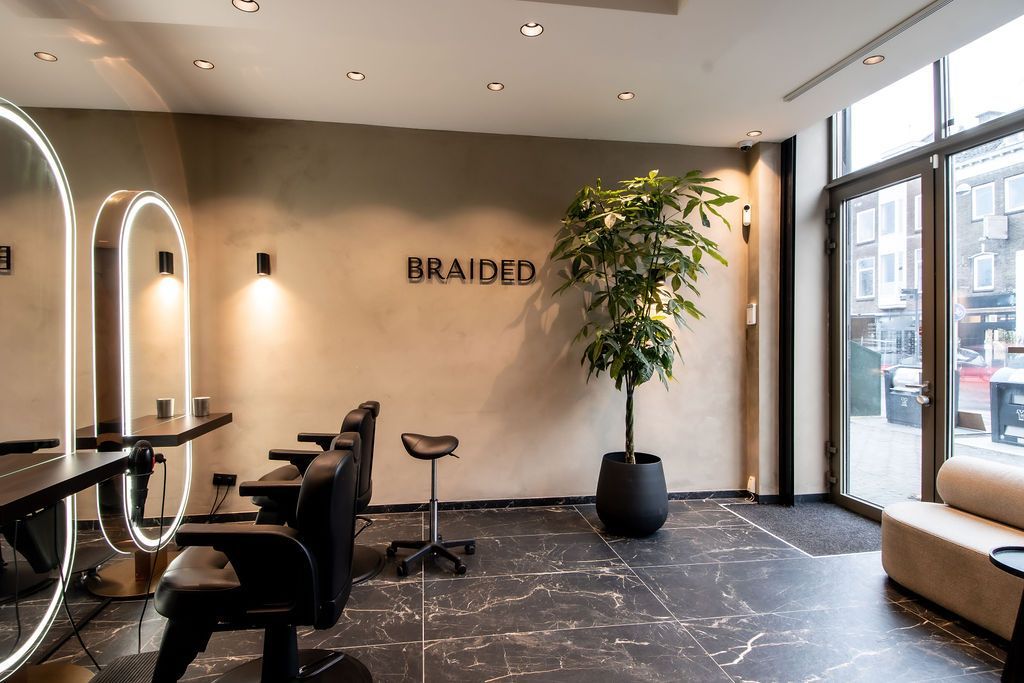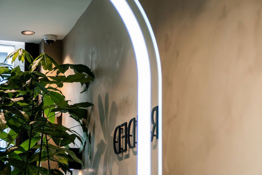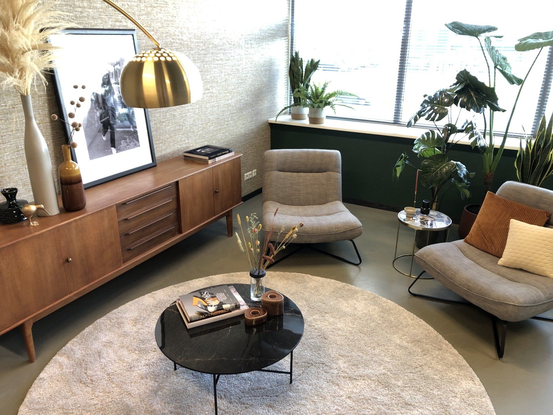 Nu was het de makelaar zelf die ging verhuizen. Deze gave ruimte is omgetoverd tot een modern kantoor waar extra aandacht is besteed aan de akoestiek. Door de op maat gemaakte akoestische baffles blijft de ruimte zijn open karakter behouden, maar scheidt het toch de ontvangst van het kantoorgedeelte. Door de planten op pilaren te plaatsen benadrukt dit de royale hoogte en geeft dit een heel ruimtelijk gevoel.