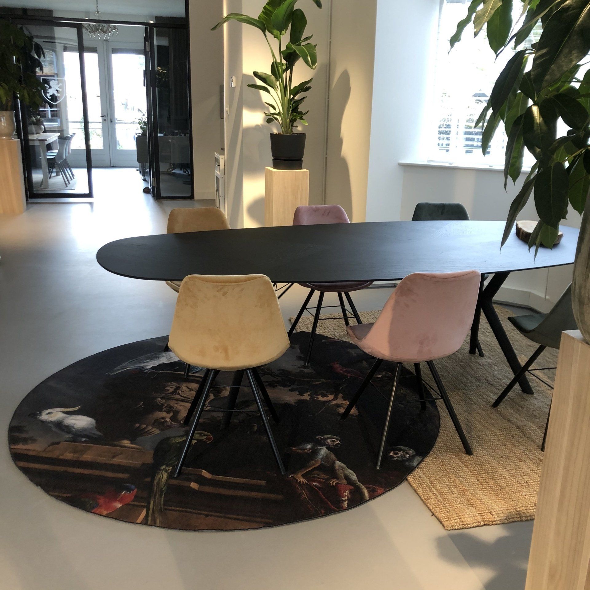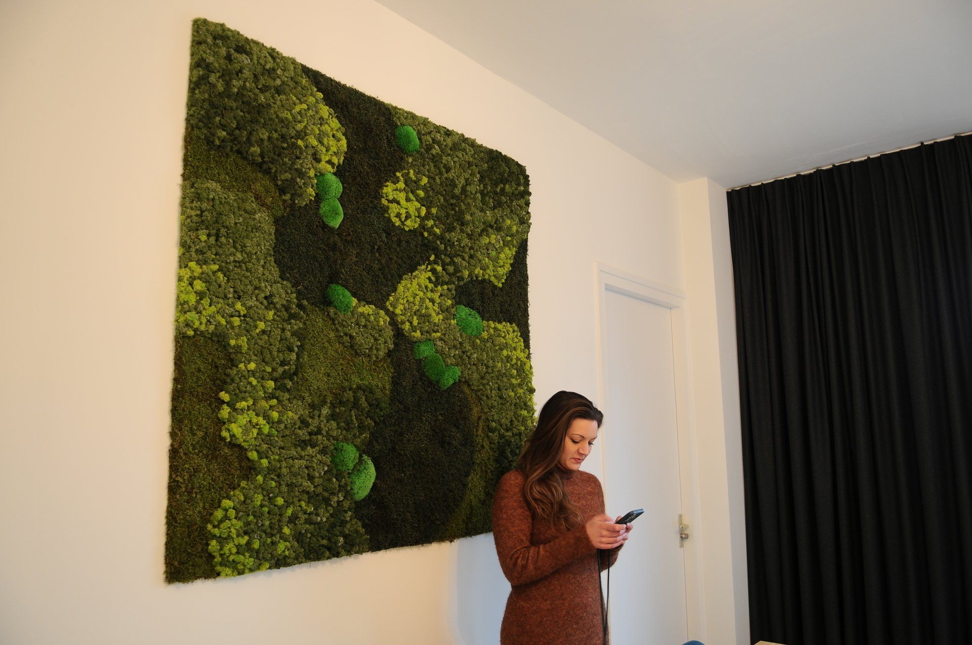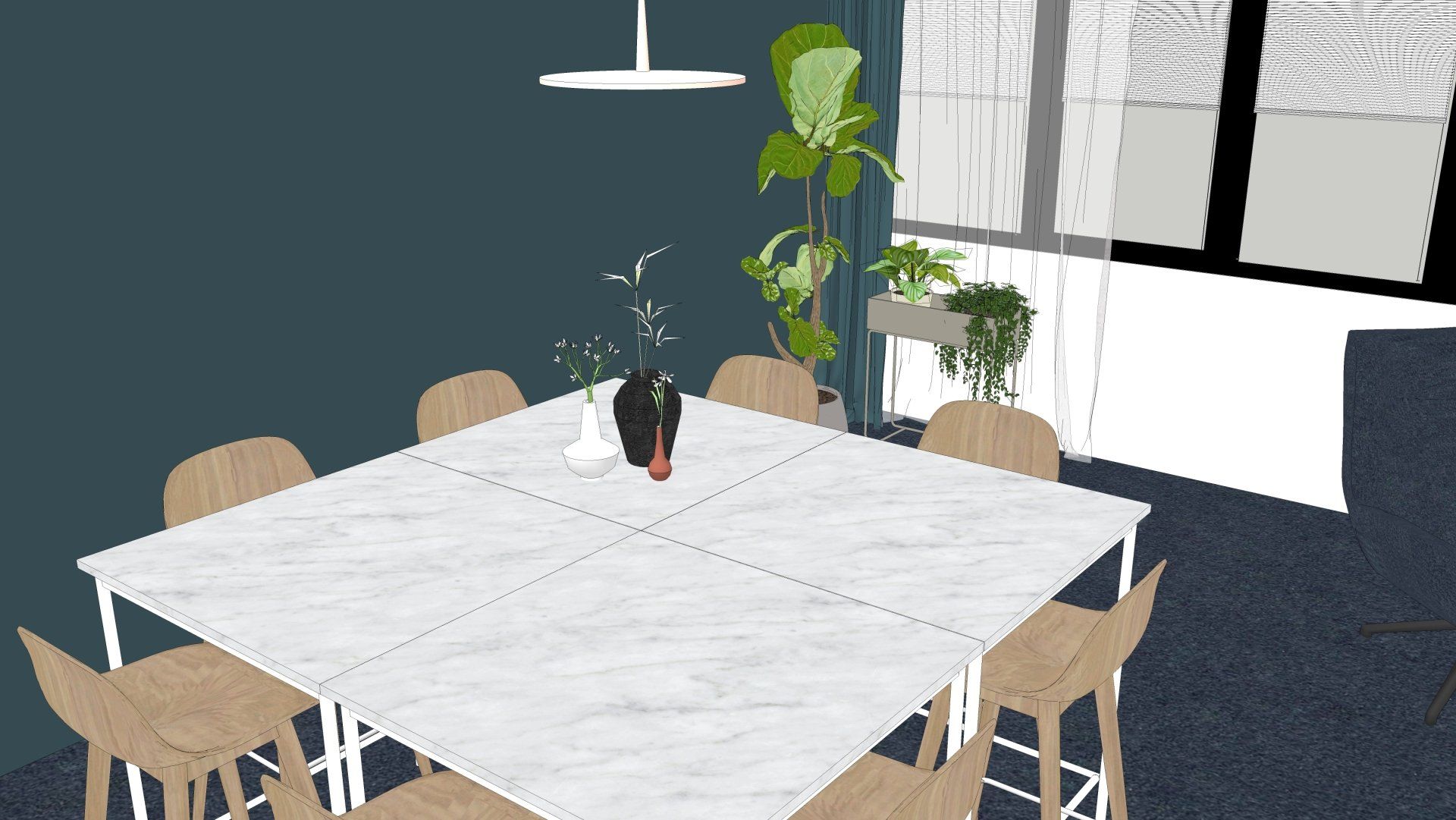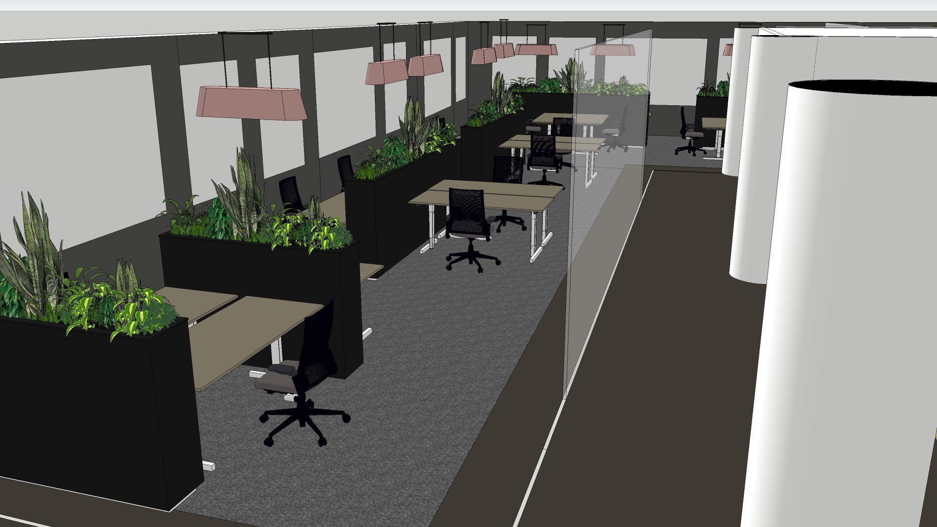 Nu was het de makelaar zelf die ging verhuizen. Deze gave ruimte is omgetoverd tot een modern kantoor waar extra aandacht is besteed aan de akoestiek. Door de op maat gemaakte akoestische baffles blijft de ruimte zijn open karakter behouden, maar scheidt het toch de ontvangst van het kantoorgedeelte. Door de planten op pilaren te plaatsen benadrukt dit de royale hoogte en geeft dit een heel ruimtelijk gevoel.