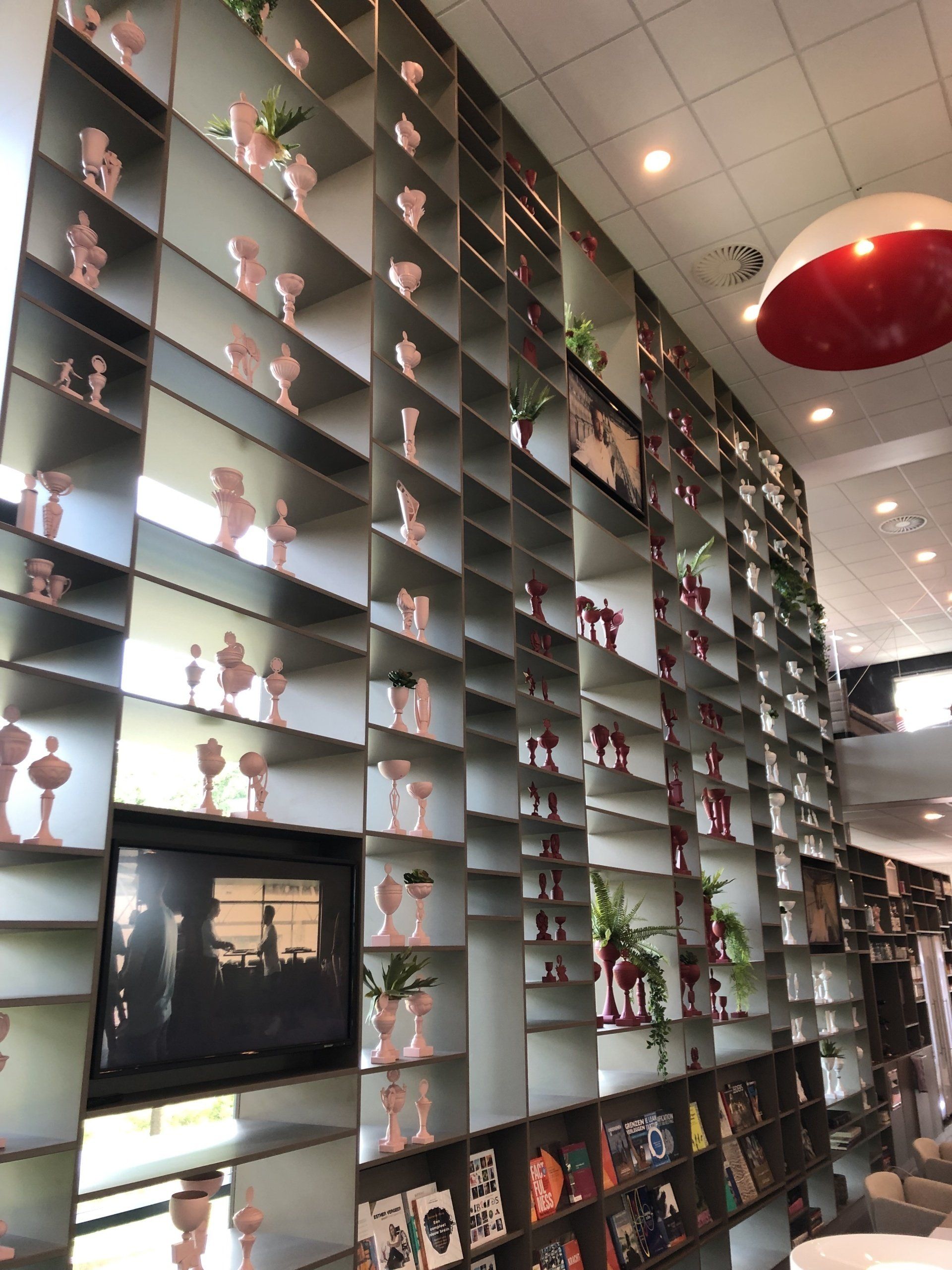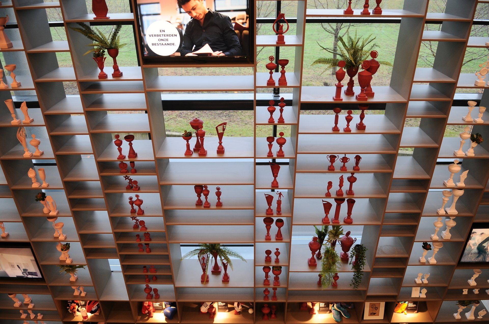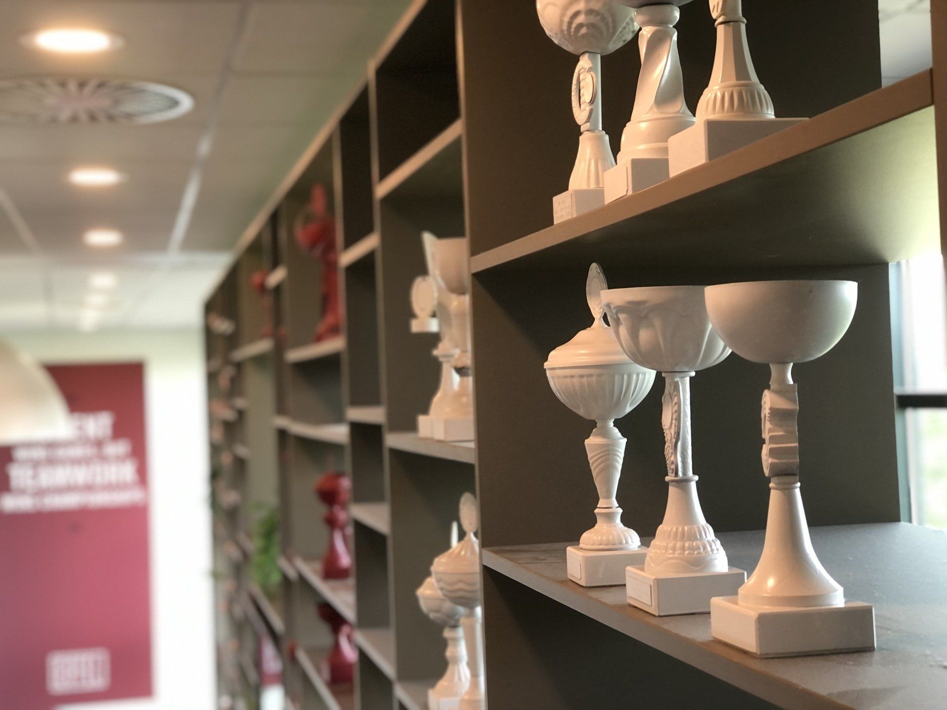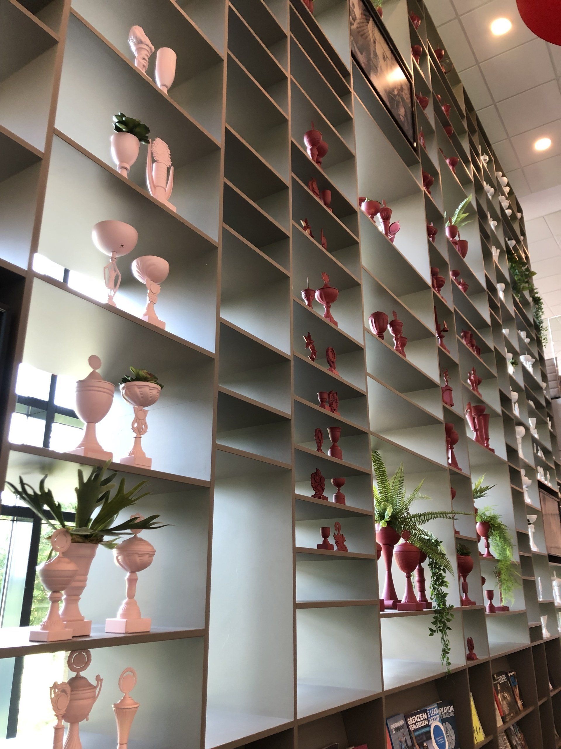 "Welkom in ons clubhuis". Dit bedrijf werkt keihard om samen aan de top te blijven en nog harder vieren ze hun successen. LAUDE mocht een concept neerzetten in de entree van het hoofdkantoor in Arnhem. Door de wedstrijdbekers in de kleuren van de nieuwe huisstijl te spuiten past dit concept perfect bij de nieuwe look-and-feel van dit bedrijf. De meer dan 300 verschillende wedstrijdbekers zijn niet nieuw aangeschaft, maar al deze prijzen zijn ooit door iemand gewonnen en op deze plek krijgen deze trofeeën een tweede leven. Op deze manier is dit project een goed voorbeeld van een duurzame manier van werken waar LAUDE voor staat.