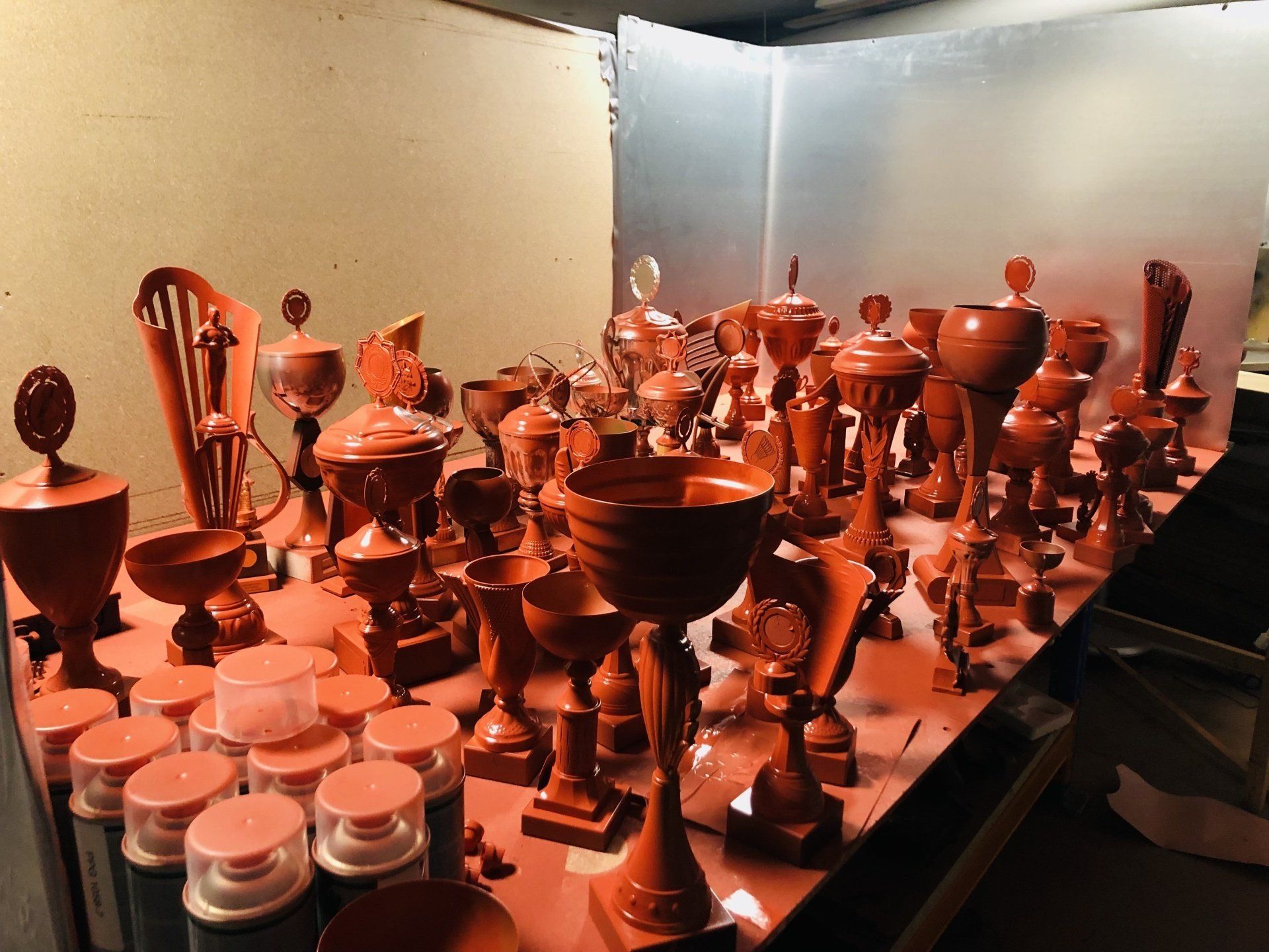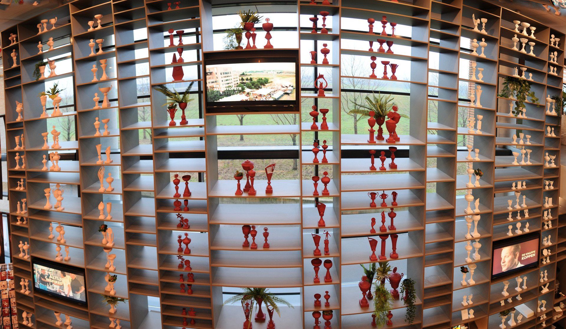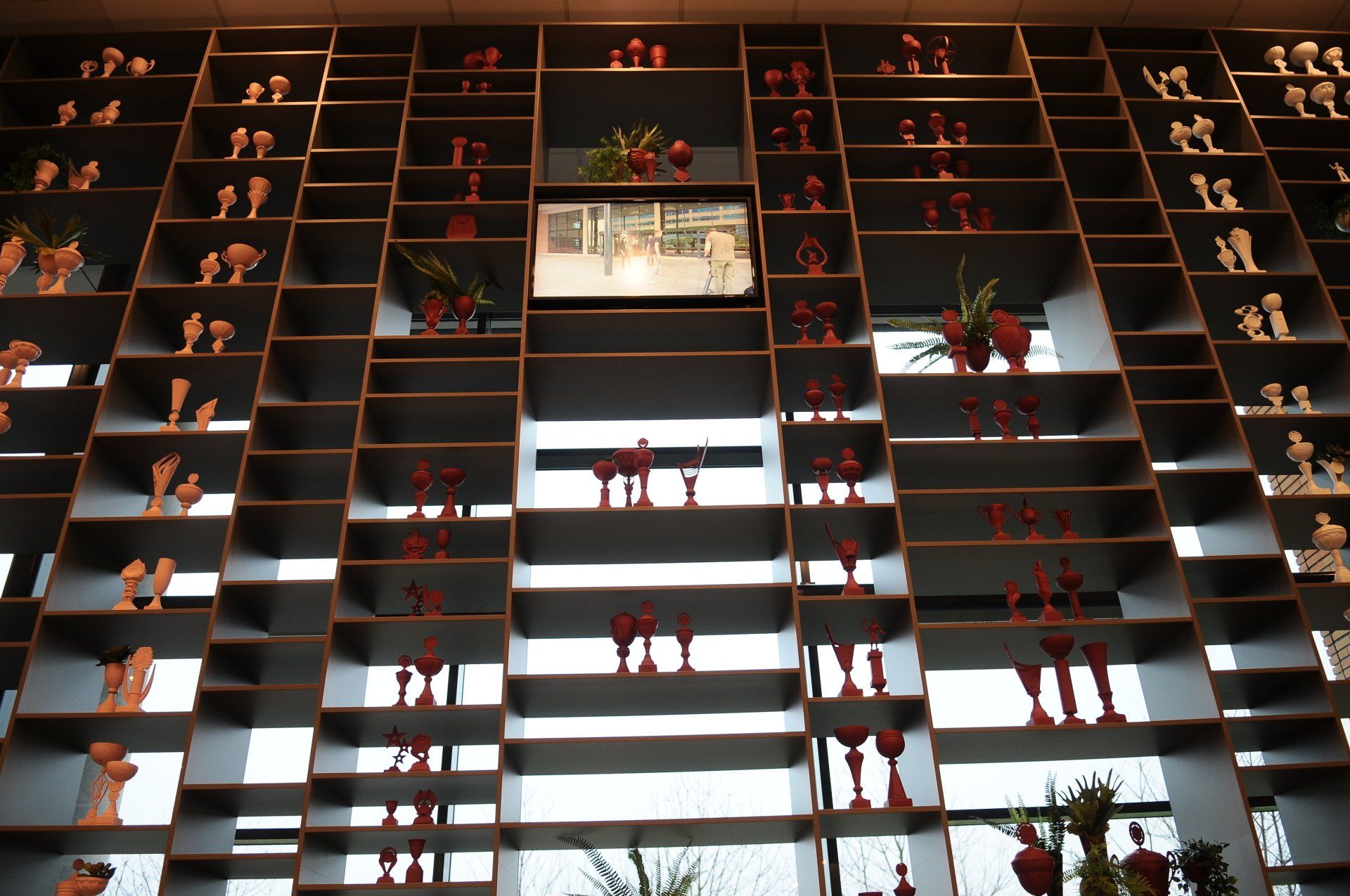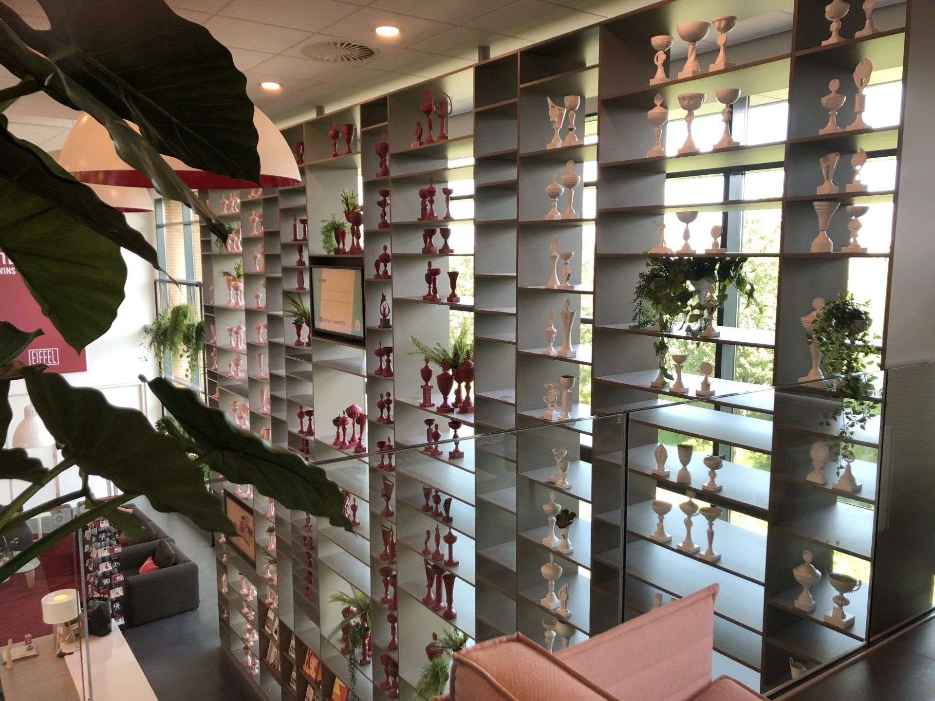 "Welkom in ons clubhuis". Dit bedrijf werkt keihard om samen aan de top te blijven en nog harder vieren ze hun successen. LAUDE mocht een concept neerzetten in de entree van het hoofdkantoor in Arnhem. Door de wedstrijdbekers in de kleuren van de nieuwe huisstijl te spuiten past dit concept perfect bij de nieuwe look-and-feel van dit bedrijf. De meer dan 300 verschillende wedstrijdbekers zijn niet nieuw aangeschaft, maar al deze prijzen zijn ooit door iemand gewonnen en op deze plek krijgen deze trofeeën een tweede leven. Op deze manier is dit project een goed voorbeeld van een duurzame manier van werken waar LAUDE voor staat.